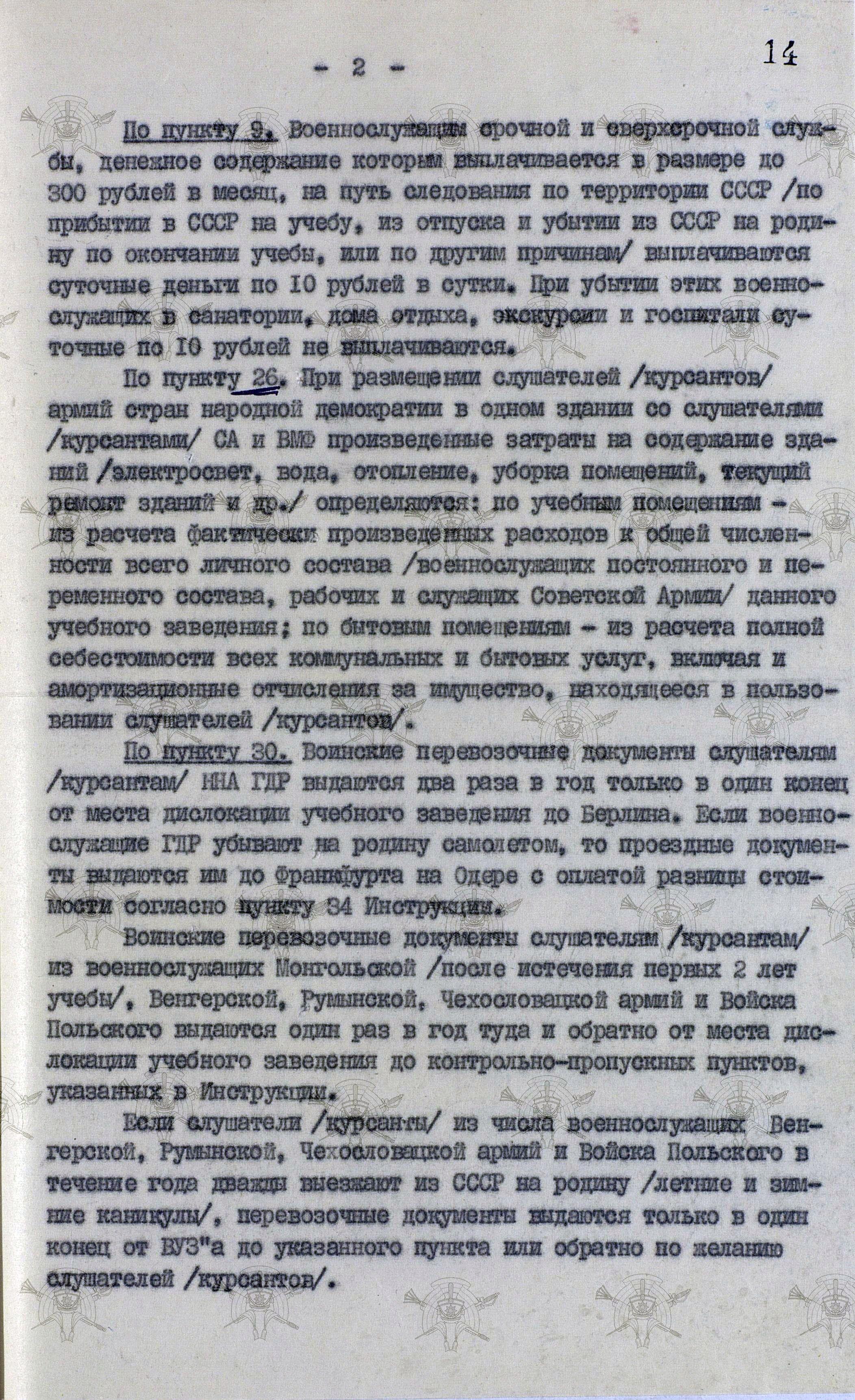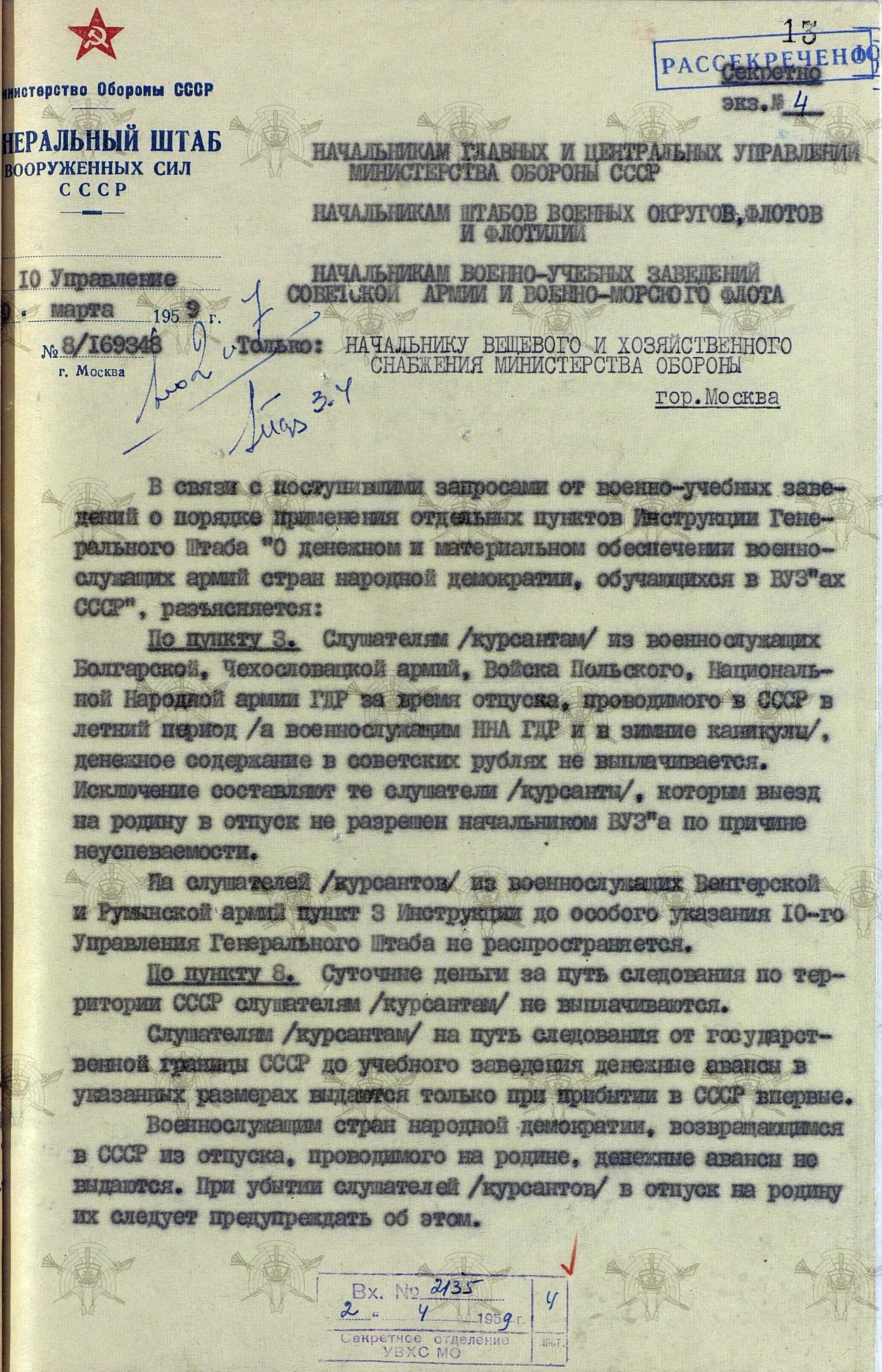 Денежно-материальное обеспечение военных из стран народной демократии, обучающихся в ВУЗ СССР.1959 г