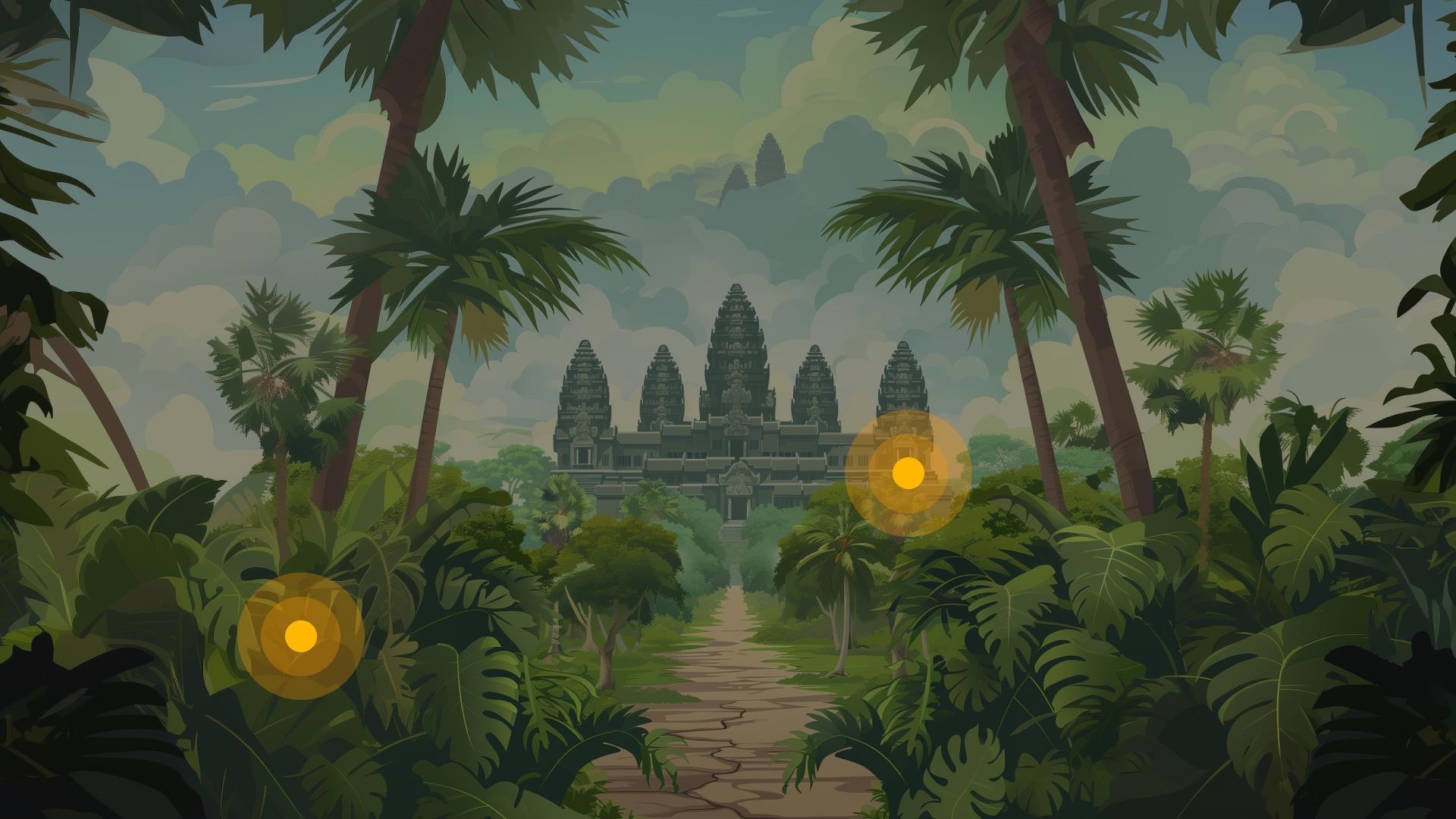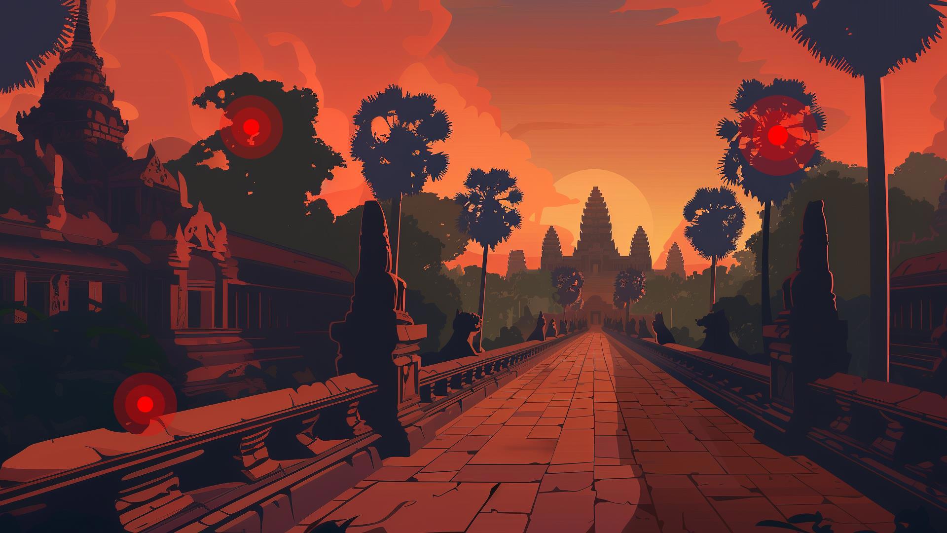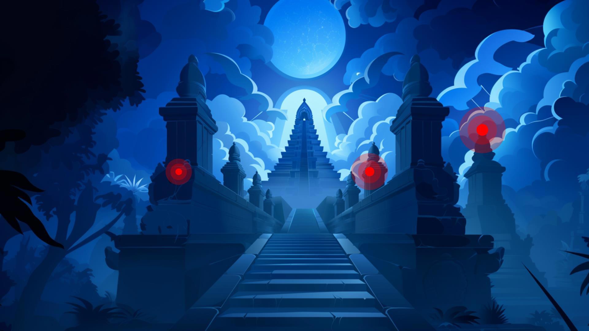 Ночь окутала древний храм в джунглях Камбоджи, заливая его мягким сиянием двойной голубой луны. Синь разливается по каменным ступеням, колоннам и облакам, словно сам воздух пропитан её тайной. Голубые идеальной формы огни мерцают на постаментах, оттеняя тёмную архитектуру загадочным свечением и манят путешественника. Всё вокруг кажется застывшим во времени, скрытым в сумраке древности, где лишь неизвестный синий свет оседает на их сетчатках, создавая завесу из теней, за которыми скрыты реальные цвета этого мира.