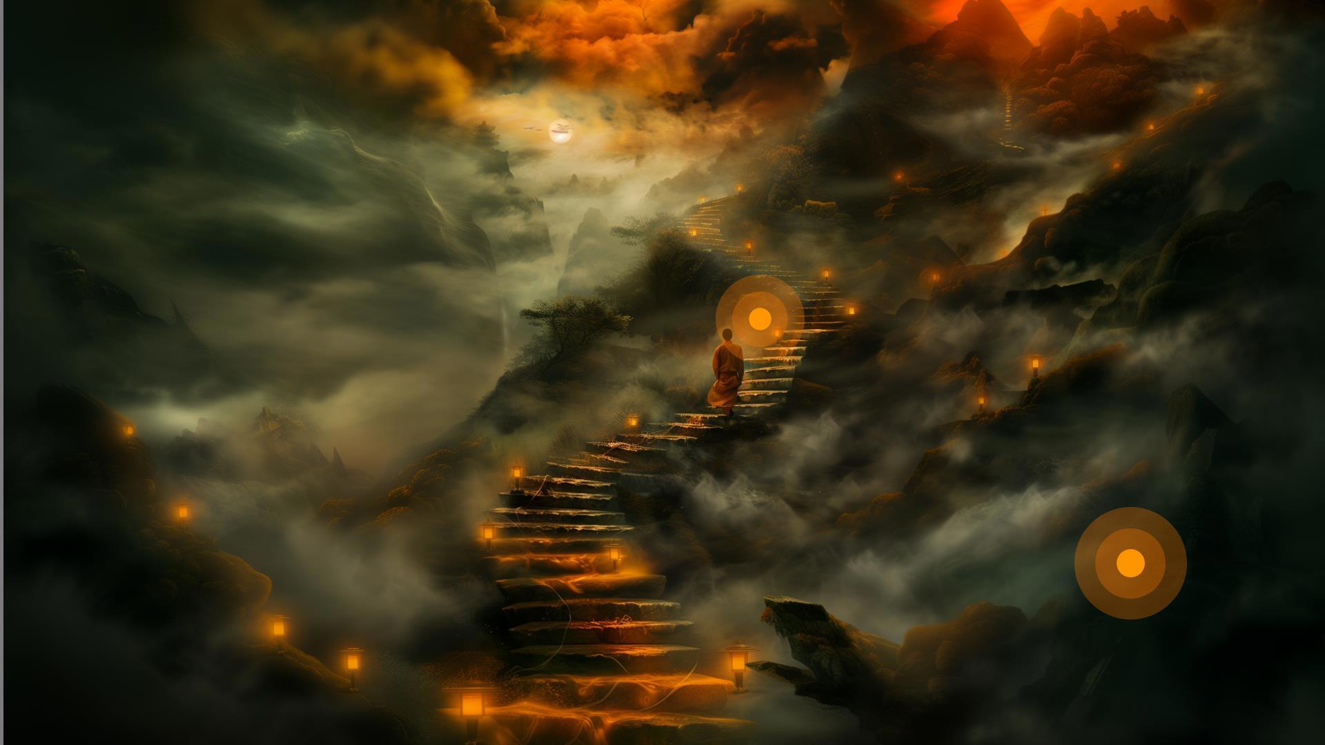 Золотистая дымка окутывает древнюю лестницу, утопаяя в теплых охровых огнях. Это всё что осталось от древнего храма. Солнце прорывается сквозь мутные облака уже тысячелетия, окрашивая мир в оттенки старинного янтаря, мягко растекаясь по камням и листве, словно застывший мед. Солнца тут не видели так же долго. В этом золотом сиянии время кажется застывшим, руины — живыми, словно пропитаны они древней мудростью как оранжевой водой. Камни лестницы испещрены эрозией - древние знания продолжают медленно но верно стирать остатки былого материального могущества. Свет и тень переплетаются, и порой слегка колышатся, будто по лестнице всё ещё ходят духи древнего и всевластного монашеского ордена. Время стёрло всё наносное и не важное, разрушив стены и превратив в песок всё внутреннее убранство. Оно оставило только действительно важную часть храма - лестницу, ведущую к просветлению, полную таинственных знаний, впитать которые могут только идущие вверх.