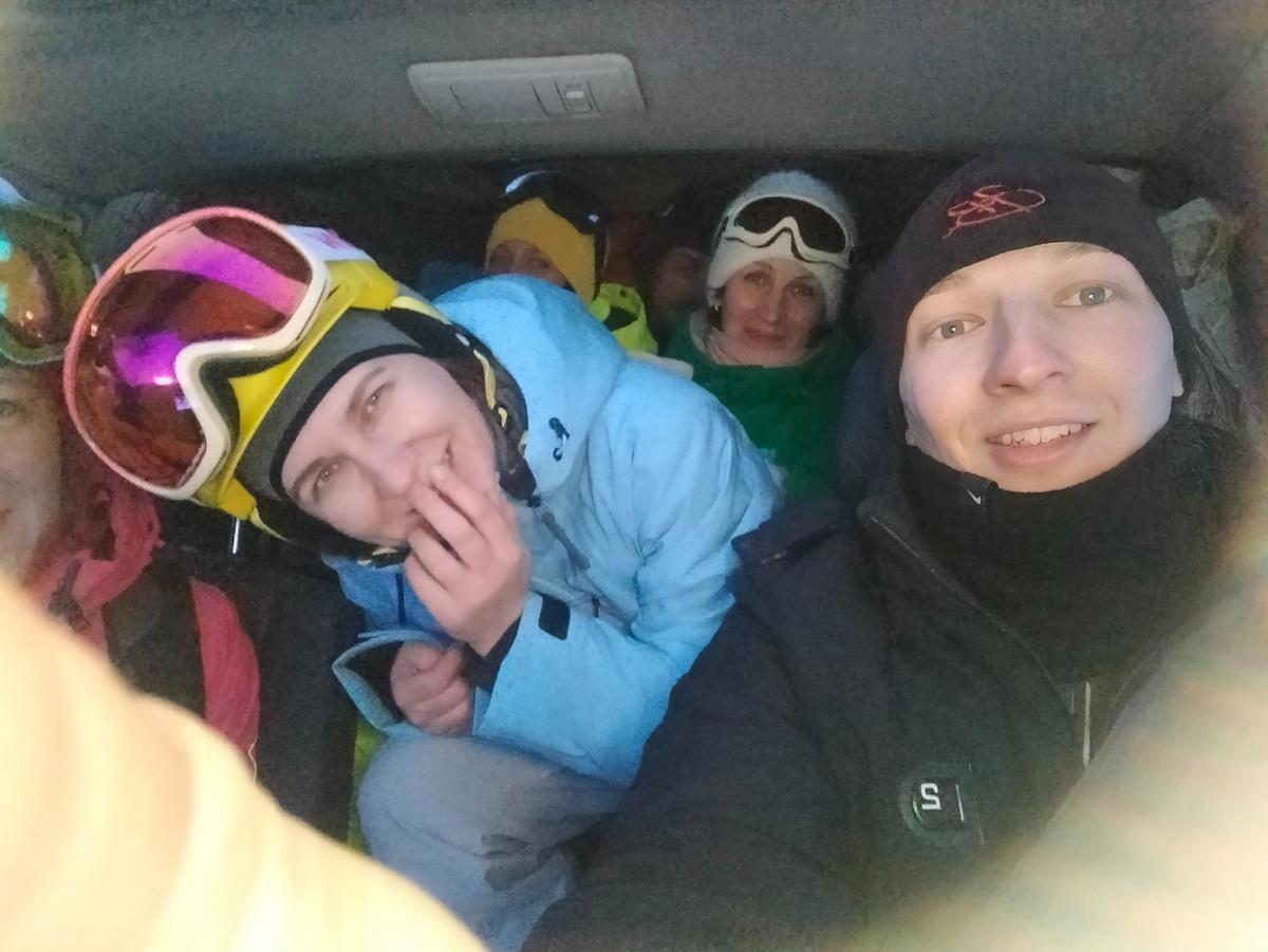 Как Вы думаете, сколько человек может вместиться в пятиместную машину? Да, чтобы ещё и ехала эта машина. М? У кого какие варианты? Но в данном случае, в этой Тойоте было ещё два откидных кресла сзади, если ничего не путаю. Но может и путаю. Важно при расчётах учитывать и тот факт, что у каждого из нас ещё и лыжи с собой или сноуборд. И всё это тоже здесь же.