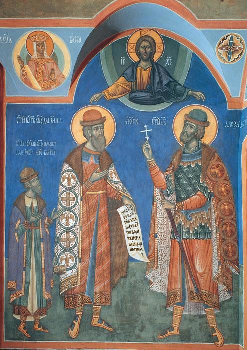 Святой блг. кн. Даниил Московский со своими родителями — св. блг. кн. Александром Невским и праведной Вассой. Настенная роспись XIX века из храма Покрова Богородицы Московского Свято-Данилова монастыря
