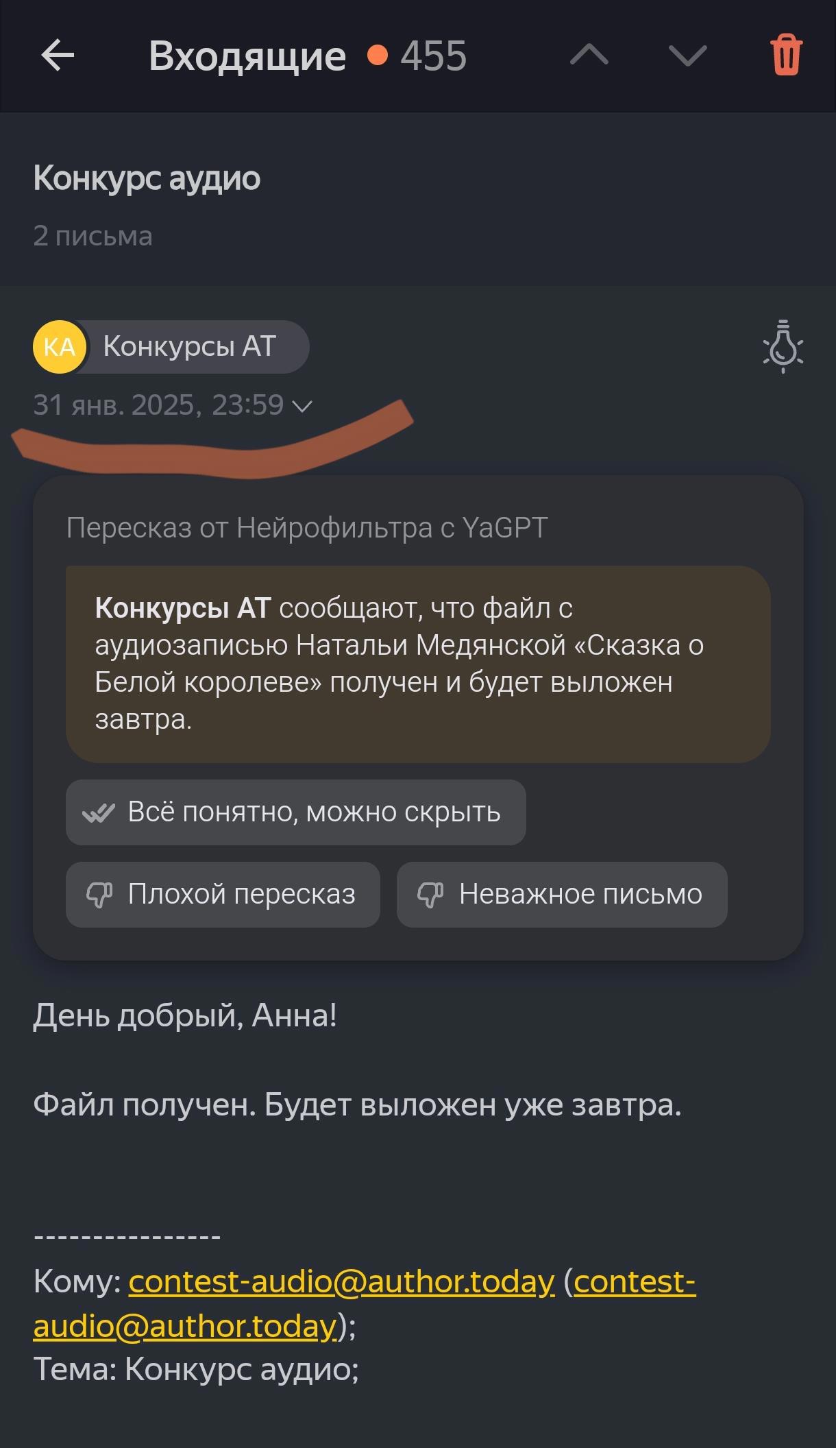 Автор: Анна СильфурВчерашний день был долгим. Рано начался и закончился для меня лишь сегодня далеко за полночь. Глубоким вечером, когда почти все уже разошлись по домам, я встала к микрофону, и время понеслось галопом: я окунулась в другой мир, стараясь его оживить, дать написанным словам мрачной сказки эмоций. И очень удивилась, когда оторвавшись от микрофона, поняла, что прошло всего-то, ну, может, минут сорок - они пролетели мгновенно. Затем обработка, получение в файле готового результата, судорожно набираю письмо в электронной почте - ведь уже без пяти полночь, через пять минут закончится приём заявок! - и жму "отправить". В 23:59 мне приходит ответ от ИИ о подтверждении приёма заявки на конкурс.