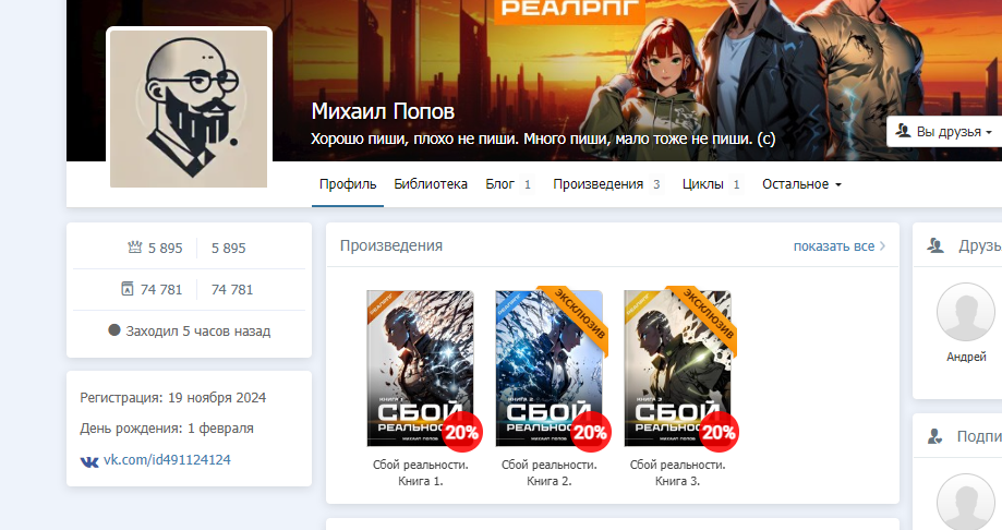 Талантливого писателя, доброго и хорошего человека поздравляю сегодня с днём рождения! Я желаю творческого вдохновения, необычных сюжетов, блестящих идей, прекрасного здоровья, большого числа почитателей, верного успеха и личного счастья в жизни.