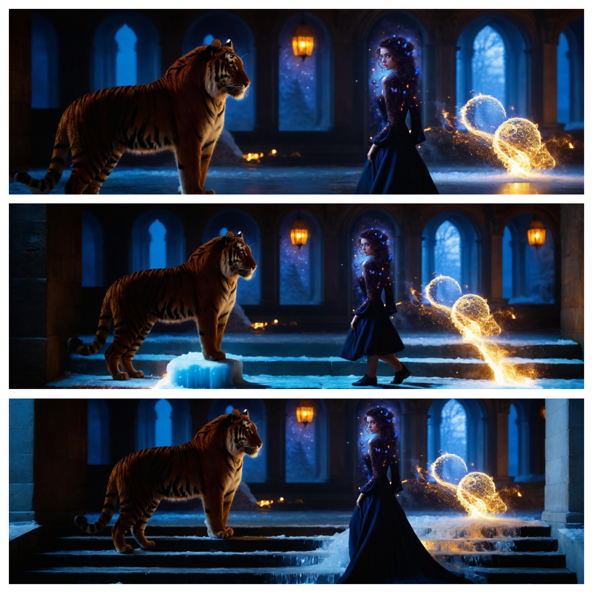 Теперь я перебирала варианты, которые позволили бы мне вписать тигра в изображение и сделать намёки на магические способности героев. Не обошлось и без косяков, временами нейросеть выдавала смешную дикость, но у меня в папках остались только короткие ноги, так как этот вариант вызвал во мне самый большой смех.