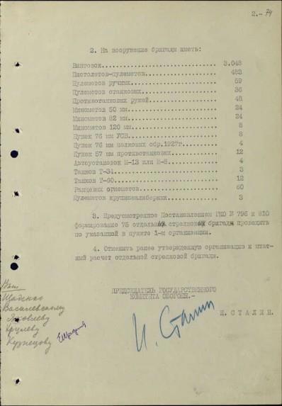 Начальнику Главного Управления Формирования и Укомплектования Войск Красной Армии отдельные стрелковые бригады, формируемые в Московском, Орловском и Харьковском военных округах, после их укомплектования личным составом, отвести и дислоцировать в Уральском, Сибирском и Средне-Азиатском военных округах.