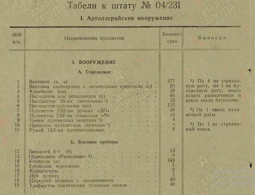 Вооружение: пистолеты и револьверы - ?; винтовки и карабины - 174, пулеметов станковых - 27, противотанковых ружей - 12.