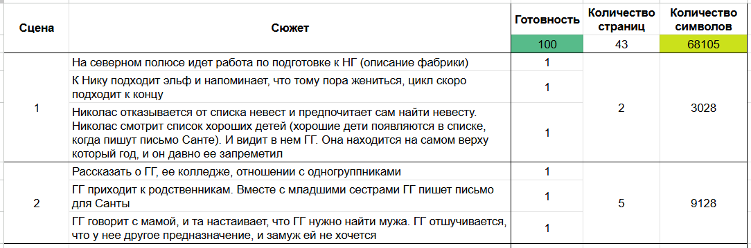 Пункт связан с планированием сюжета и используется при непосредственном написании работы. Изначально я отмечала только готовность сцен, ставя 0 или 1 напротив события внутри сцены, чтобы понимать, какие события готовы, а какие нет.