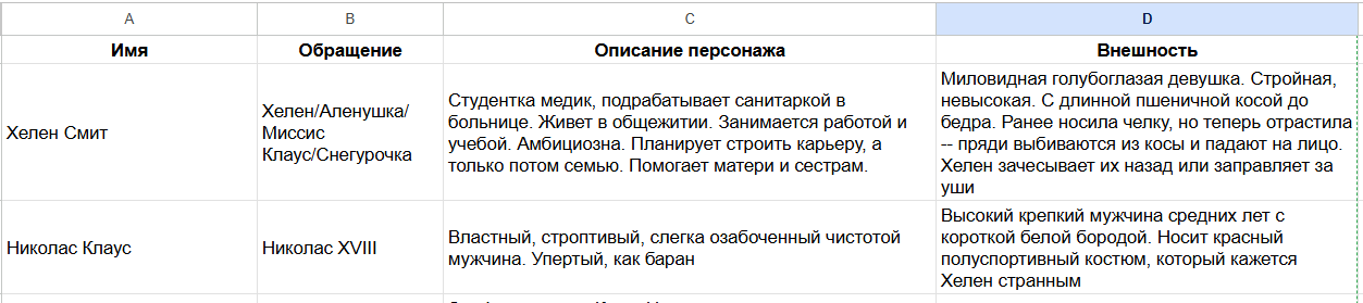 Таблица помогает продумать персонажей и не запутаться с их описании в дальнейшем. Для маленьких рассказов на десяток персонажей она не обязательна, но при написании больших циклов с полусотней героев очень помогает!