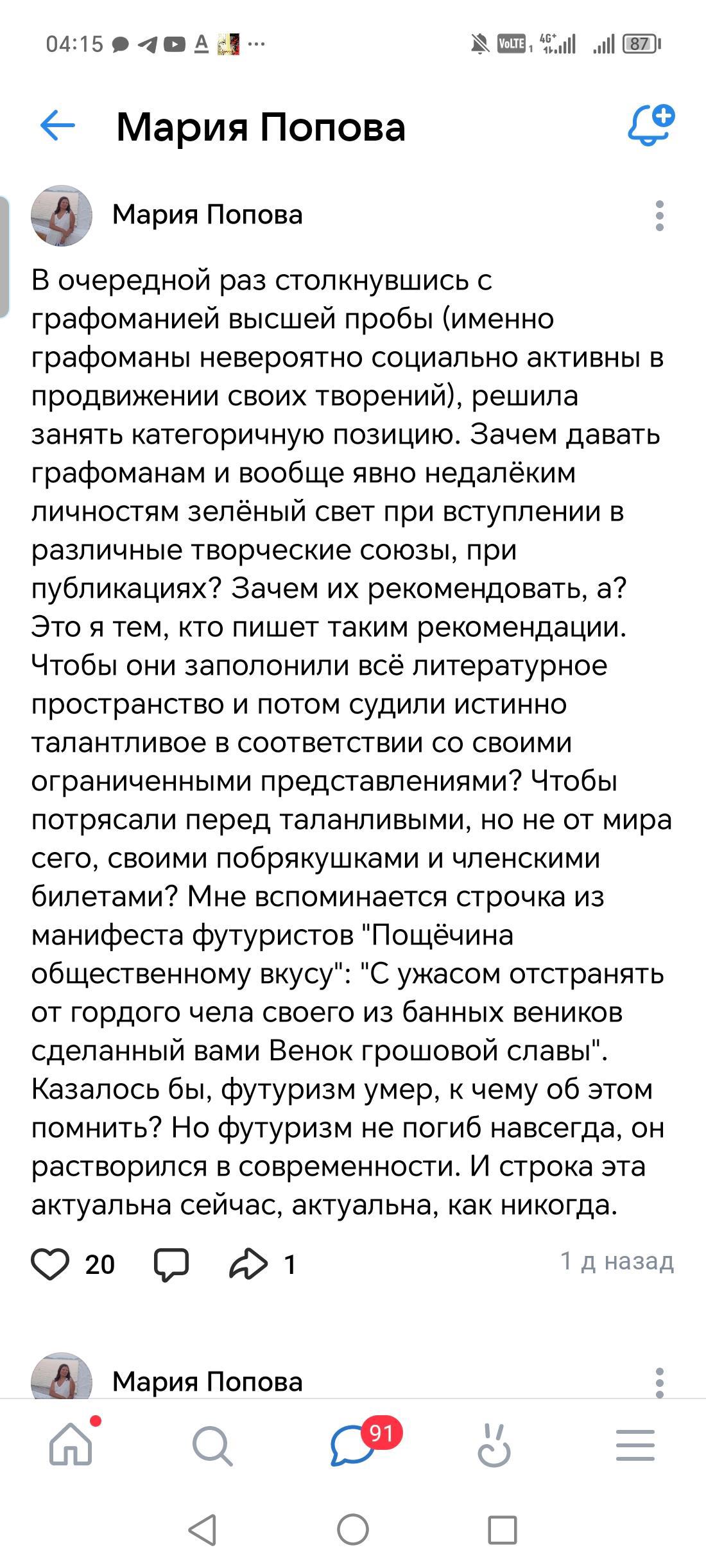 В очередной раз столкнувшись с графоманией высшей пробы (именно графоманы невероятно социально активны в продвижении своих творений), решила занять категоричную позицию. Зачем давать графоманам и вообще явно недалёким личностям зелёный свет при вступлении в различные творческие союзы, при публикациях? Зачем их рекомендовать, а? Это я тем, кто пишет таким рекомендации. Чтобы они заполонили всё литературное пространство и потом судили истинно талантливое в соответствии со своими ограниченными представлениями? Чтобы потрясали перед таланливыми, но не от мира сего, своими побрякушками и членскими билетами? Мне вспоминается строчка из манифеста футуристов "Пощёчина общественному вкусу": "С ужасом отстранять от гордого чела своего из банных веников сделанный вами Венок грошовой славы". Казалось бы, футуризм умер, к чему об этом помнить? Но футуризм не погиб навсегда, он растворился в современности. И строка эта актуальна сейчас, актуальна, как никогда.