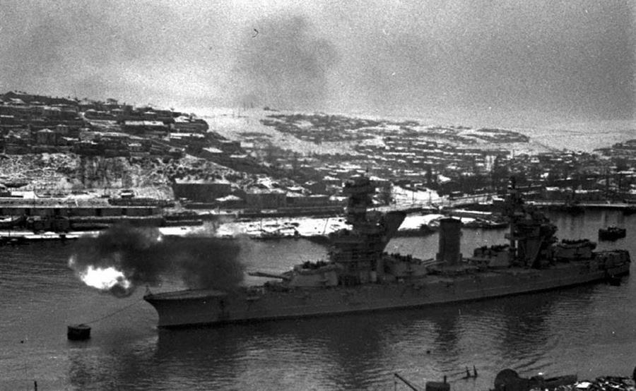 29 декабря 1941. Линейный корабль Черноморского флота «Парижская коммуна» (до марта 1921 и с 31 мая 1943 года носил имя «Севастополь») ведет огонь по позициям врага из Южной бухты Севастополя.