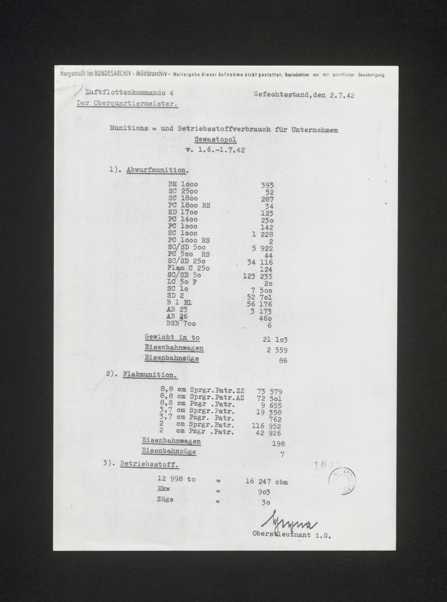 Автор: Андрей УлановУв. коллеги дали ссылку на интересный документ в ЖЖ rilarwmw -- расход боезапаса и горючего в период третьего штурма Севастополя частями Люфтваффе.