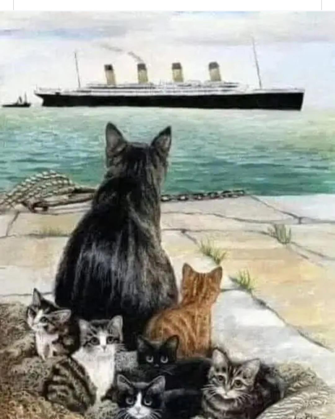 Например, старая история о корабельной кошке Дженни. Сия особа была не обычной кошкой. Моряки считали ее талисманом. А обосновалась она ни много, ни мало, а на том самом злополучном Титанике. Кто-то принес ее на борт, чтобы боролась с грызунами и запасы продуктов были в целости и сохранности. Кошку поселили в корабельном камбузе и за ней ухаживал рабочий по имени Джим Малхолланд. Во время морских скитаний Дженни удачно родила котят, и Джим нашёл им уютное местчко тоже рядом с кухней. Забота о кошке-маме и её котятах вносила разнообразие в рабочие будни Джима.. Дженни казалась счастливой и довольной своим уютным домом рядом с теплыми котлами. Тут находились её котята, а вкусные остатки с кухонного стола ее всегда щедро снабжал Джим.