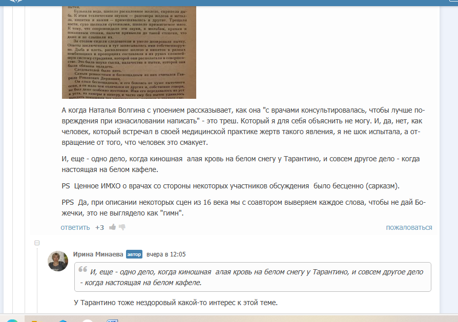 Наталья Волгина с упоением рассказывает, как она «с врачами консультировалась, чтобы лучше повреждения при изнасиловании написать» - это треш. Который я для себя объяснить не могу. И, да, нет, как человек, который встречал в своей медицинской практике жертв такого явления, я не шок испытала, а отвращение от того, что человек это смакует.