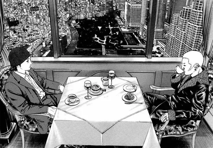 Кроме сильнейшего и крутейшего сюжета, который с каждым новым поворотом кардинально меняет правила игры с этой мангой, в ней есть и крутые персонажи. Большая часть истории будет крутится только вокруг Ито и Накоши со вставками второстепенных персонажей на одну арку. И взаимоотношения Ито и Накоши - это, наверное, лучшее взаимодействие персонажей из всех прочитанных мною манг! В их отношения прямо веришь, а благодаря гениальному построению диалогов с кучей контрастных ракурсов лиц и отдельных частей лица, каждый их диалог превращается в экшн-сцену, в которой ты следишь за тем, кто кого сможет переиграть морально. Саспенс в диалогах просто великолепен: они затягивают так, что вы можете прочесть несколько глав чистого диалога между ними - и даже не заметить этого!