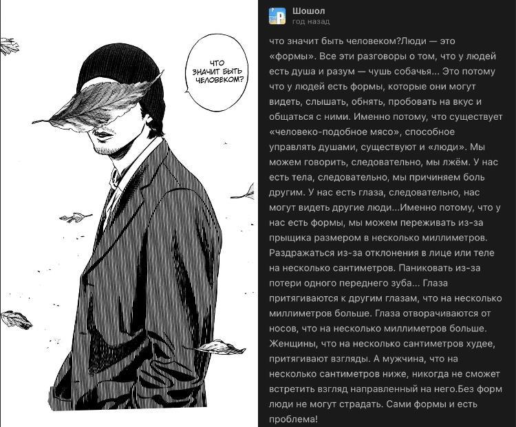 Если заинтересовала завязка, то готовьтесь к обилию разного рода жести в манге. Но, ко всему прочему, там есть множество крутых и сильных моно- и диалогов про сущность человека. Один из таких - в своем роде культовый монолог Накоши «Что значит быть человеком?» Привожу его собранную со страниц версию: