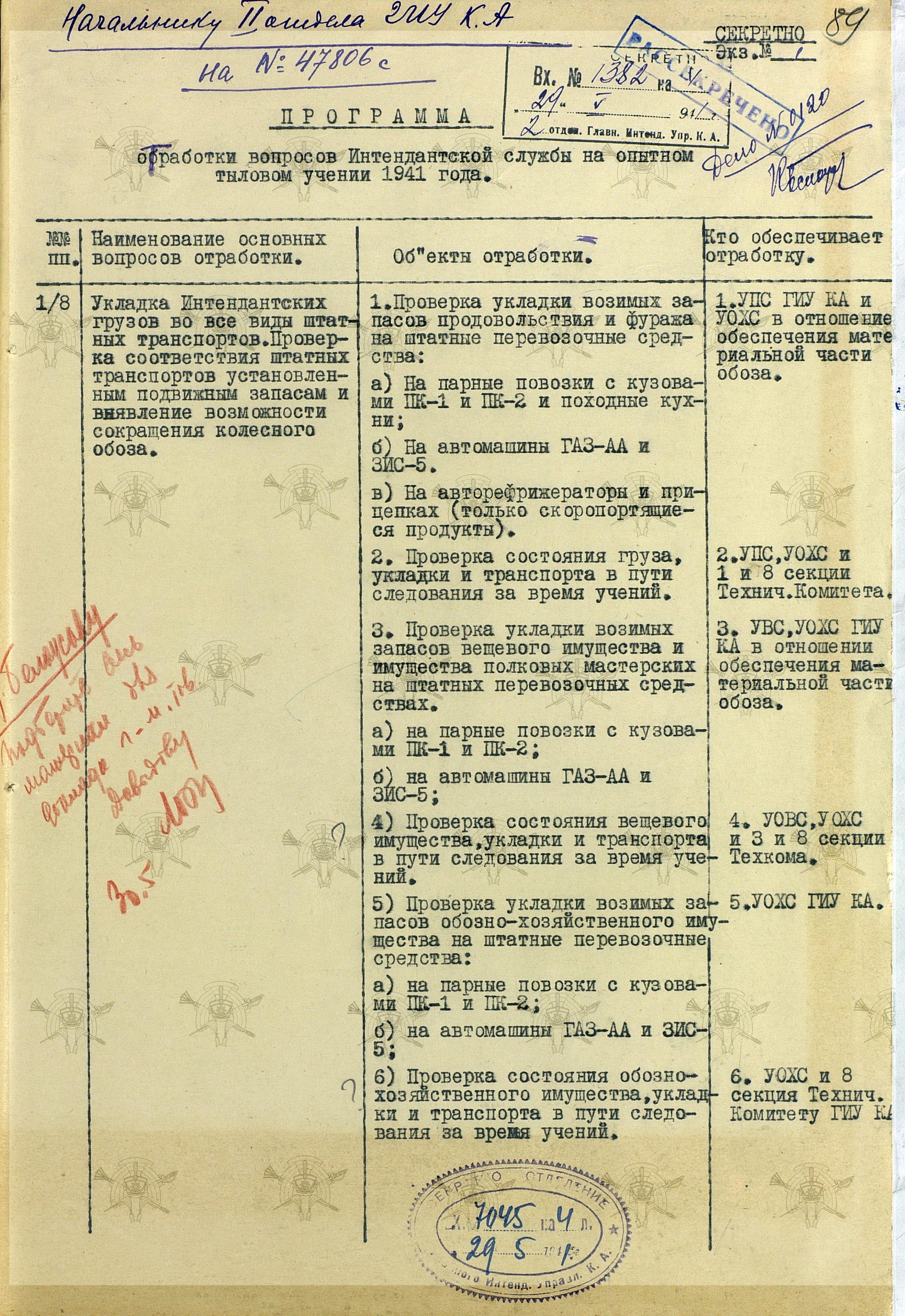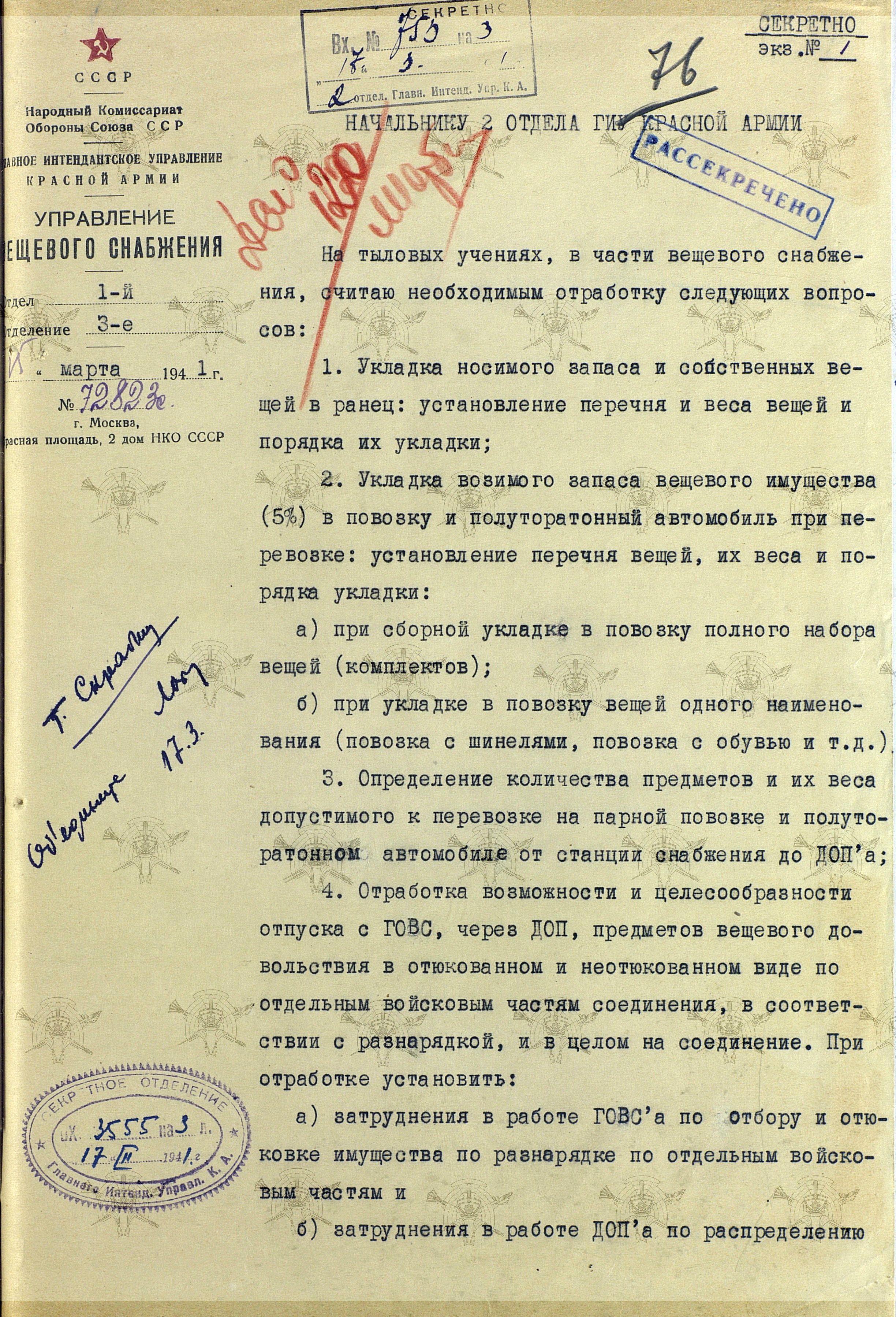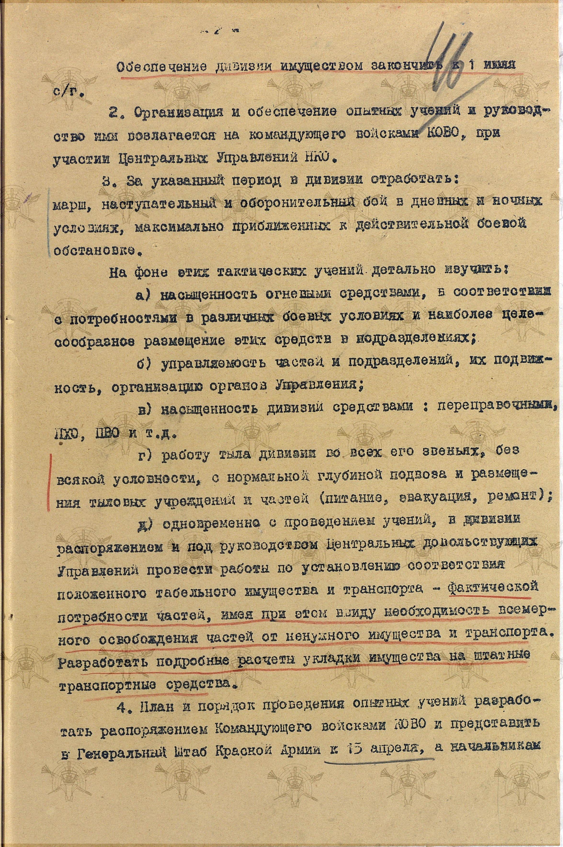 Начнём с указаний начальника Генерального штаба КА об организации учений в 1941 году. Обратите внимание, на то, какую роль отводит Генштаб работе всех звеньев тыла: