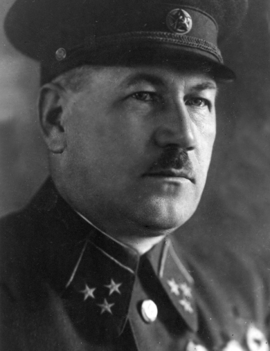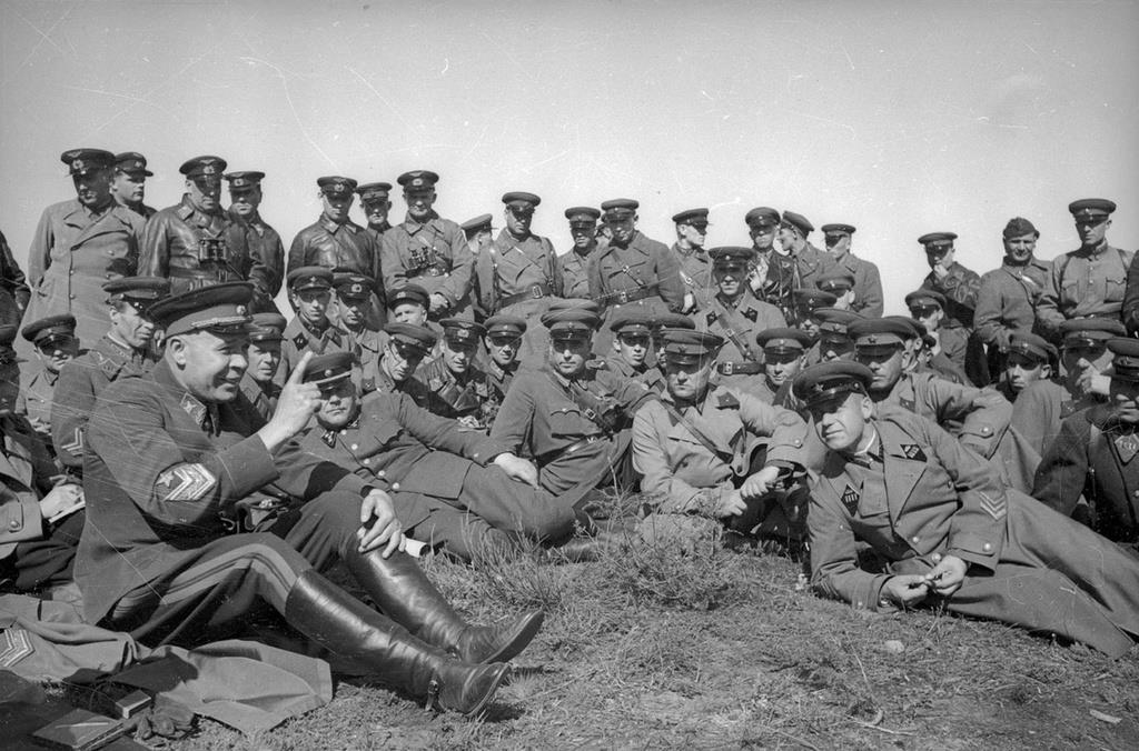 Нарком обороны маршал Семен Константинович Тимошенко (1895—1970) беседует с участниками учений Западного особого военного округа (ЗапОВО). Правее Тимошенко — Герой Советского Союза генерал-полковник танковых войск Дмитрий Григорьевич Павлов (1897-1941), командующий войсками ЗапОВО.