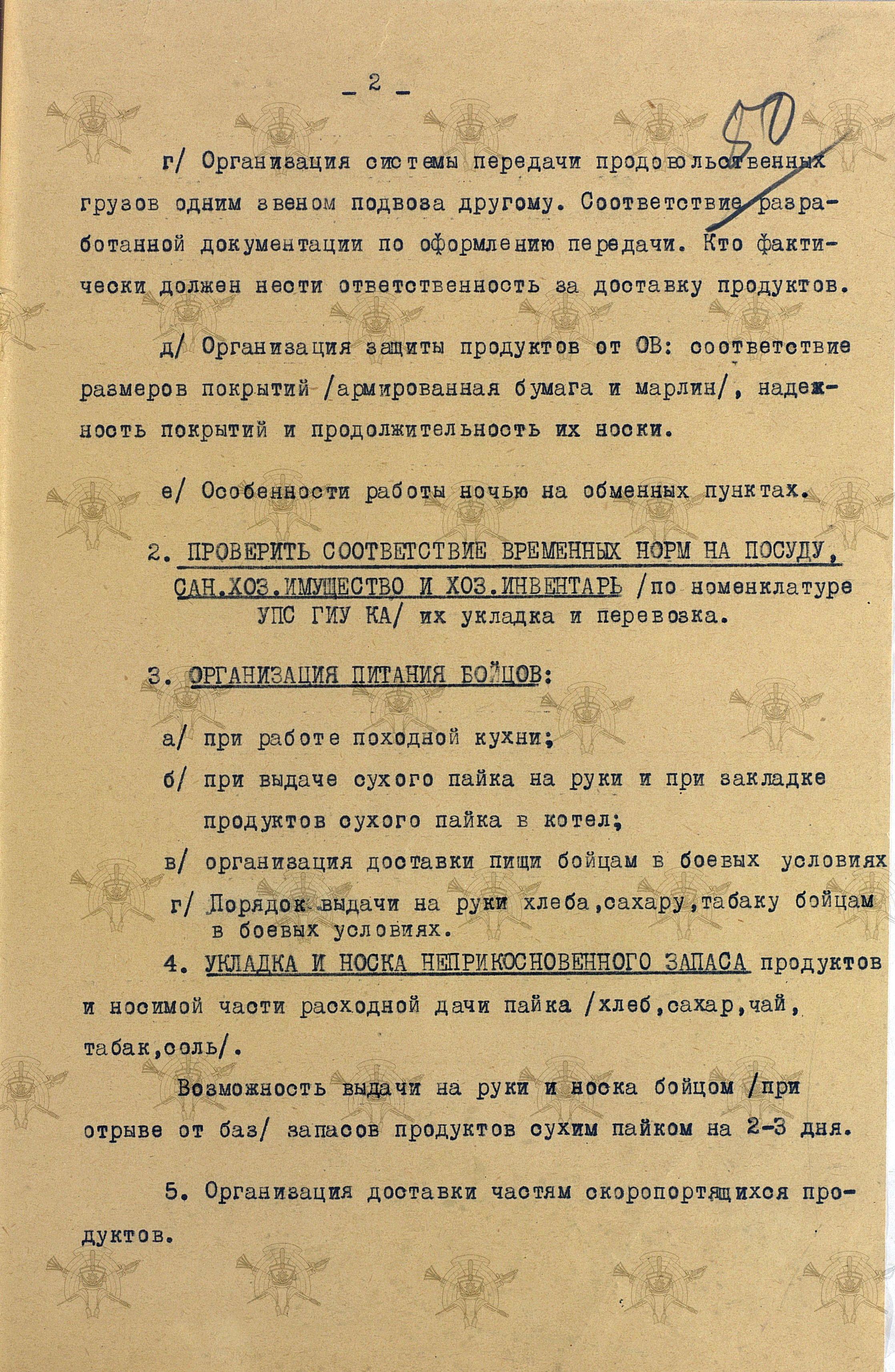 В освобожденную гранатную сумку укладывался двухдневный носимый неприкосновенный запас продовольствия, состоявший из: 700 гр. сухарей, 1 банки консервов, 100 гр. сала, 150 гр. концентратов 1 блюдо и 250 гр.II блюда, 100 гр. сахара, 60 гр. соли и 4 гр. чаю.».