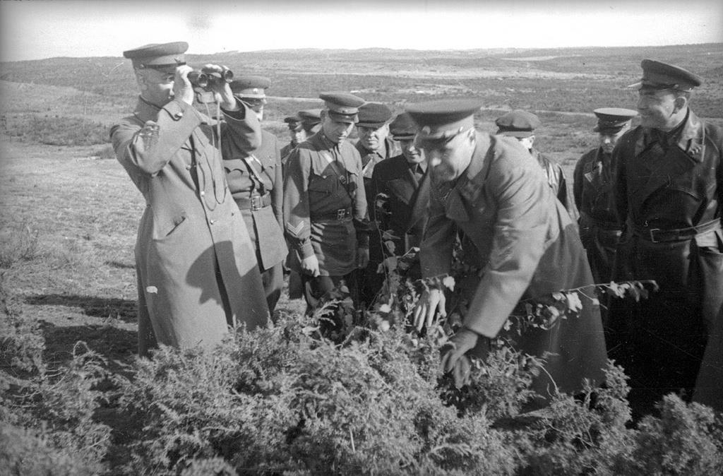 Нарком Семен Тимошенко осматривает маскировку. Тактические учения в Западном Особом военном округе. Дата съемки: август - сентябрь 1940