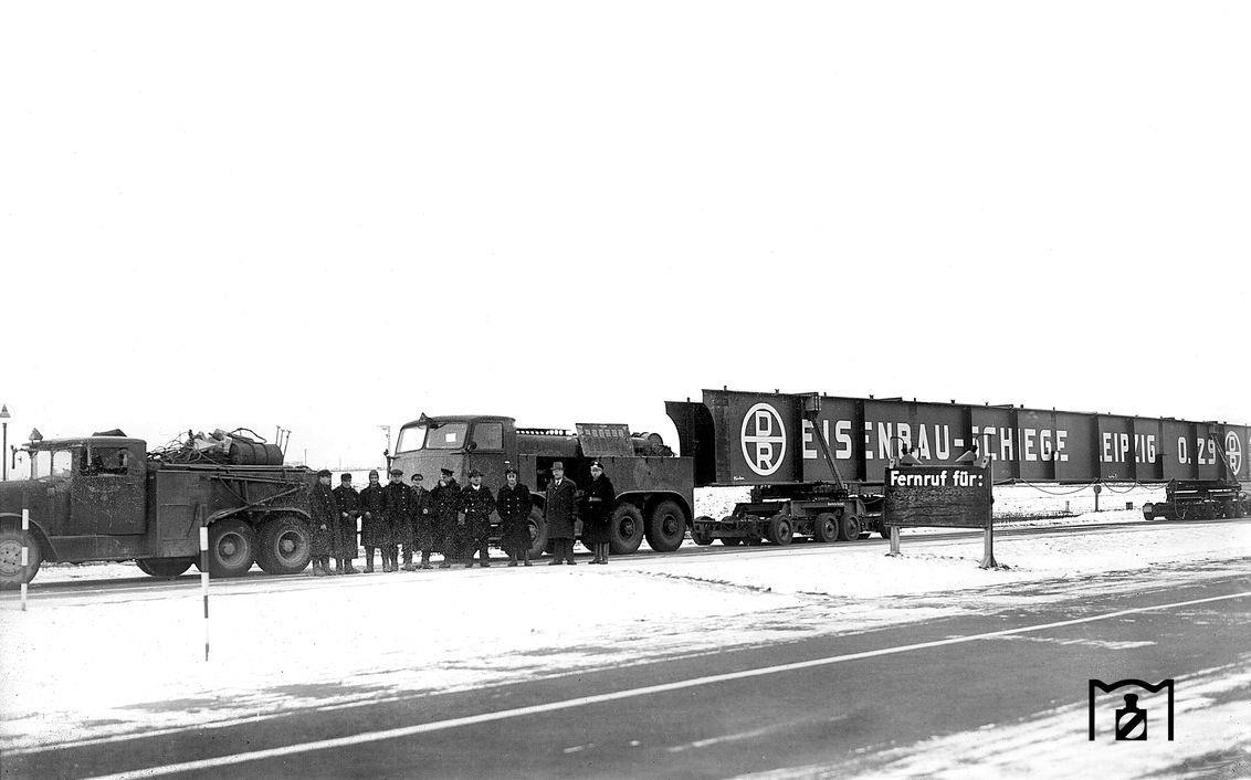 Транспортировка пролета железнодорожного моста фабрики Eisenbau-Schiege из Лейпцига для Deutsche Reichsbahn. Тягач - это тягач Kaelble "DR 70071" типа Z6 R3A, передний тягач типа Z6 R 2A 100 уже за рамками кадра. (1939) Фото: RVM