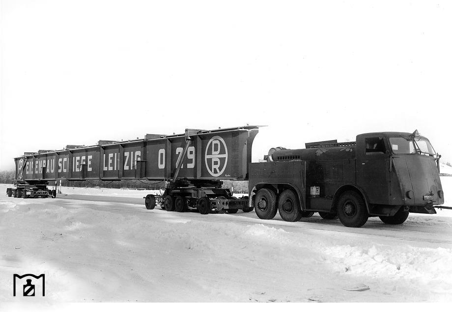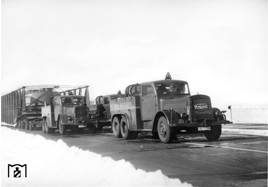 Транспортировка части конструкции моста из Лейпцига. Из-за неблагоприятных погодных условий тягач Kaelble Z6 R3A получает переднюю тягу от Kaelbe Z6 R2A 100. (1939) Фото: RVM