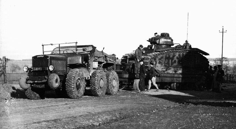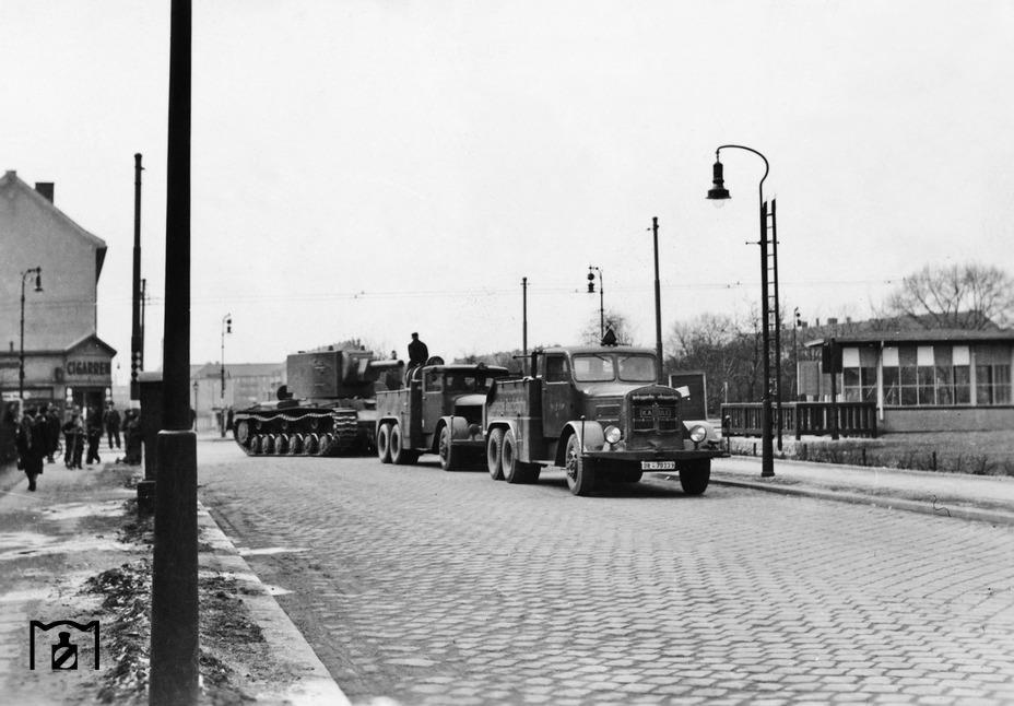 Буксировка тяжелого советского трофейного танка 57т потребовала объединения усилий двух тягачей Kaelble типов Z6R 2A 100 и Z6W 2A 130. (1941)