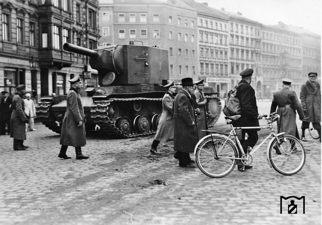 Транспортировка советского основного боевого танка типа KW2 в Берлинский Люстгартен, где во время войны выставлялось трофейное оружие. На заднем плане на одном из домов можно прочитать вывеску / вывеску "Plaza Gastertänten". В адресной книге Берлина за 1941 год есть запись "Площадь Гастштеттен Кюстринер Платц 10". Название "Плаза" изначально принадлежало варьете, расположенному на старом Восточном вокзале (в просторечии также называемом Кюстринским вокзалом = старым и оригинальным вокзалом пруссаков. Восточная железная дорога). Варьете находилось немного севернее бывшего Силезского вокзала, который во времена ГДР носил название Остбанхоф, затем назывался Хауптбанхоф, а сегодня снова называется Остбанхоф. Во время съемки заведения общественного питания, казалось бы, могли включить название соседнего заведения в свое собственное название в качестве "маркетинговой меры", не прибегая к судебным искам. Таким образом, танк стоит на Кюстринской площади к северу от Силезского вокзала. (1941)