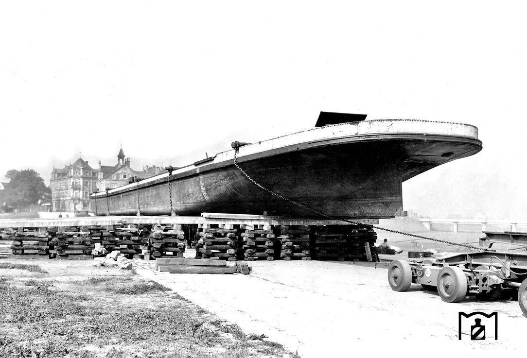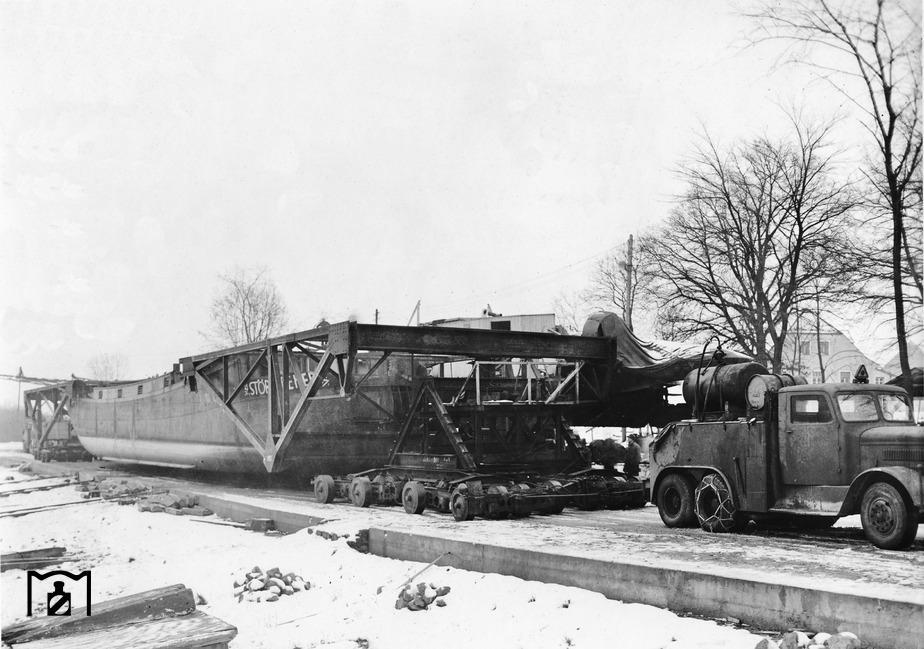 Транспортировка корпуса судна, получившего название "Штёртебекер", который удерживается в носовой и кормовой частях в качестве самонесущего груза внутри конструкции. (1942) Фото: РВМ