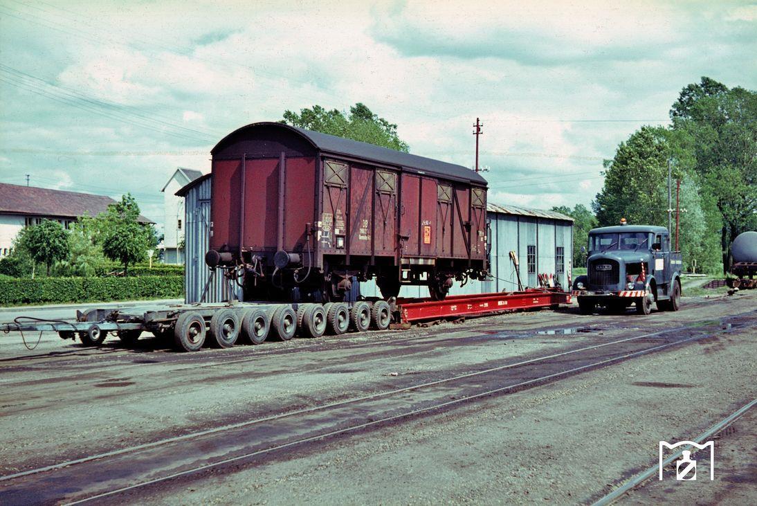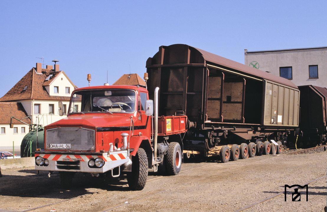 Транспортировка вагона Hbis с тягачом Faun из Остероде-ам-Гарц на склад Райффайзен в Дудерштадте. Федеральная железная дорога Германии прекратила поставлять грузовые вагоны с тягачами в 1987 году. Большинство дорожных прицепов и тягачей было продано частным компаниям. (29.09.1985) Фото: профессор д-р Вилли Хагер