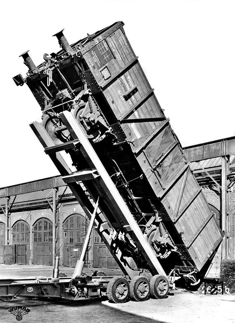 Гидравлическая наклонная платформа позволяла разгружать открытые грузовые вагоны с торцевой стороны без необходимости разгрузки их с прицепа. Однако этот вариант не прижился, осталось только два построенных прототипа. (1935) Фото: RVM (WUMAG)