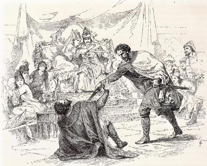 Убийство Юрия Московского Дмитрием Грозные Очи в Орде. Неизвестный художник, 2-я пол. XIX века