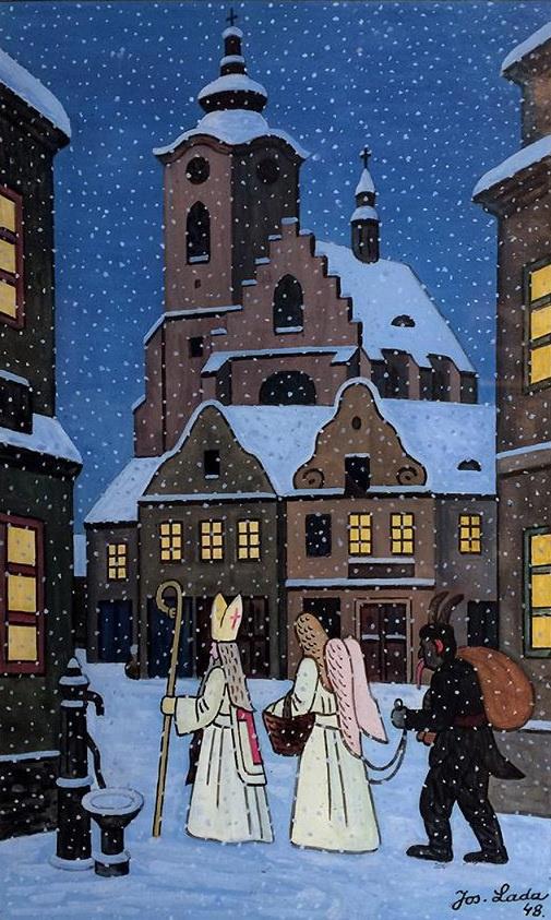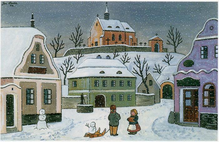 Синие ранние сумерки на пустых улицах, ряды домов с характерно изгибающимися волютами на фронтонах, заснеженными крышами и янтарно светящимися окнами, черные ветви деревьев в морозном небе, забавные фигурки ряженых на маленькой деревенской площади или другая зимняя ночь, в крупных и редких хлопьях падающих снежинок, с уснувшими домами и единственным освещенным окном («Зимой в полночь»)—вся эта волшебная и реальная страна мира и тишины увидена как бы широко открытыми глазами ребенка, впервые и остро ощутившего красоту того, что его окружает. Как и все остальное, созданное Ладой, его работы в театре связаны с традициями народного творчества. Они пленяют красочностью, юмором, душевным весельем («Волынщик из Стракониц» К/ Тыла, 1930; «Проданная невеста» Б. Сметаны, 1936; «Черт и Кача» А. Дворжака, 1952; несколько сказок для детей и др.). В 40-е годы Лада много работает как писатель, пишет книгу воспоминаний «Хроника моей жизни» (1942), сердечную и образную.