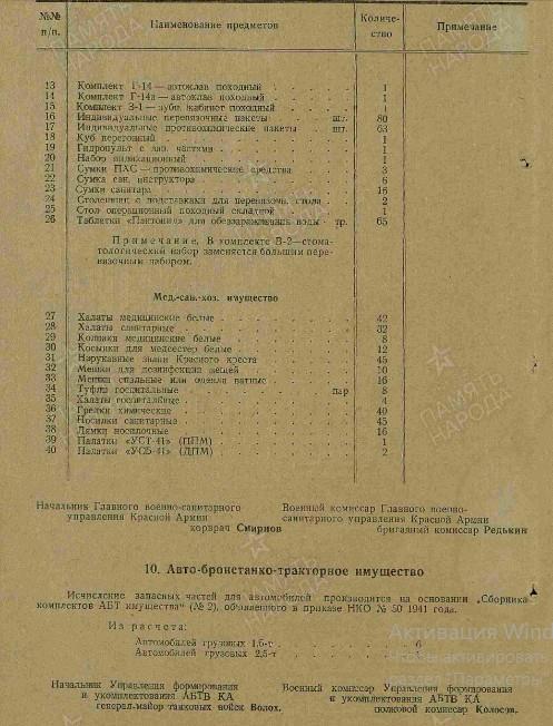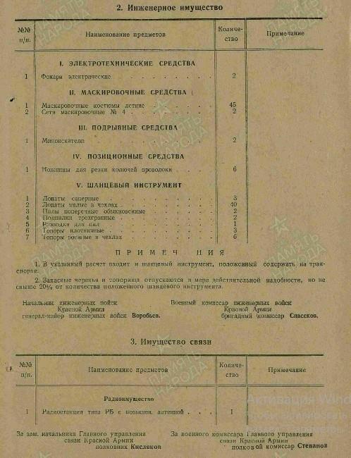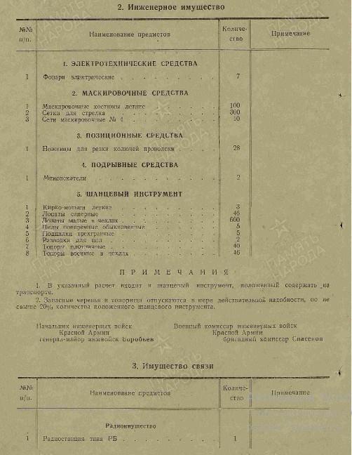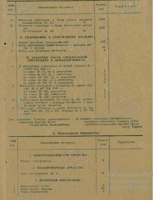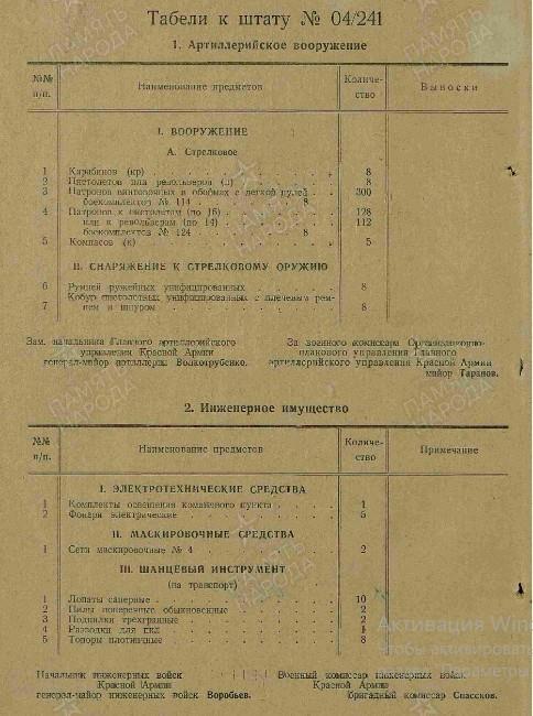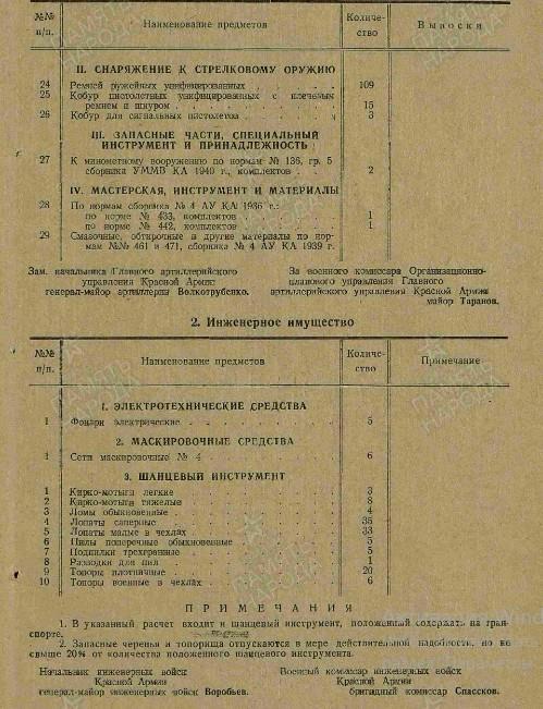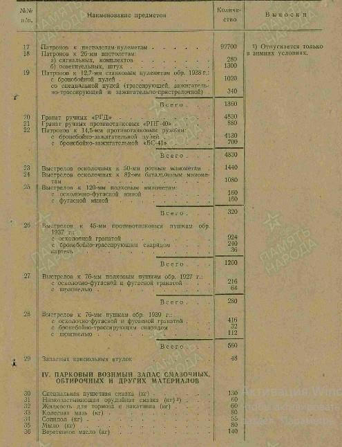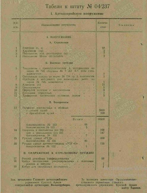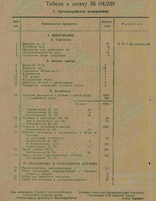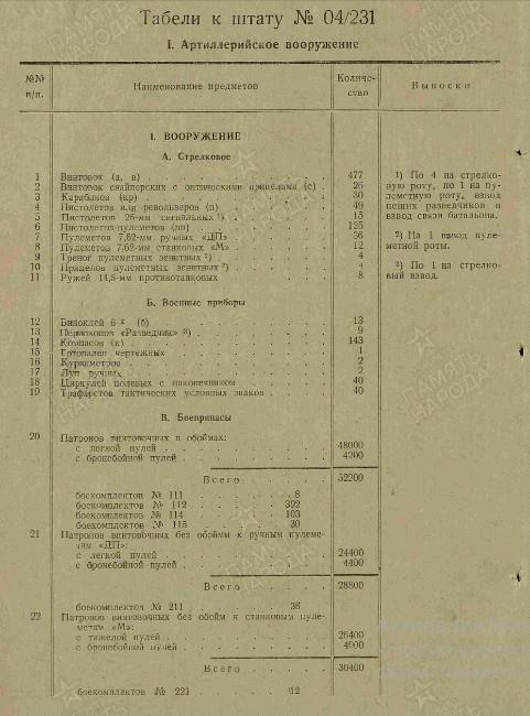 Вооружение: пистолеты и револьверы - 49, винтовок снайперских "СВМ" - 8, винтовок снайперских "СВТ-40" - 18, винтовок самозарядных "СВТ-40" - 374, винтовок - 103, карабинов - 30, пулеметов ручных ДП-27 - 36, пистолеты-пулемёты - 125, пулеметов станковых "М" - 12, противотанковых ружей - 8.