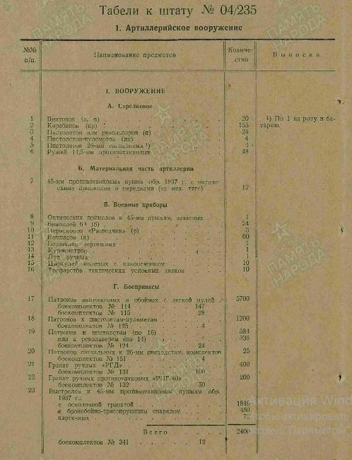 Вооружение: пистолеты и револьверы - 24; пистолеты-пулемёты - 4, винтовки - 20, карабины - 155, противотанковых ружей - 48, противотанковых пушек 45-мм - 12.