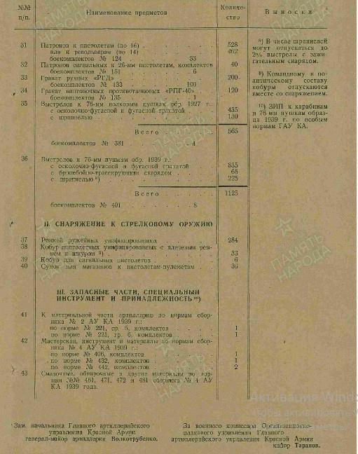 Вооружение: пистолеты и револьверы - 7, винтовки самозарядные "СВТ-40" - 88, карабины - 5.