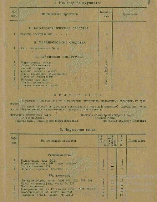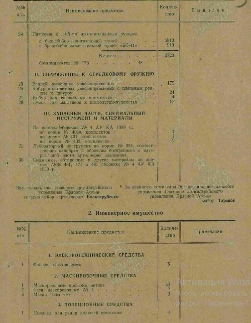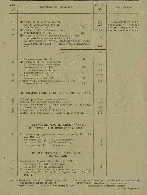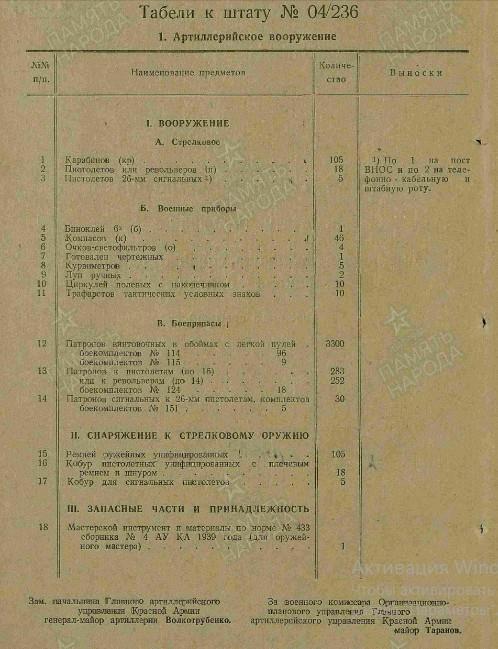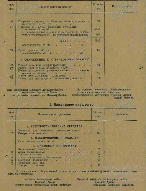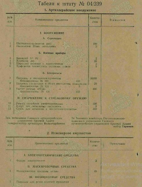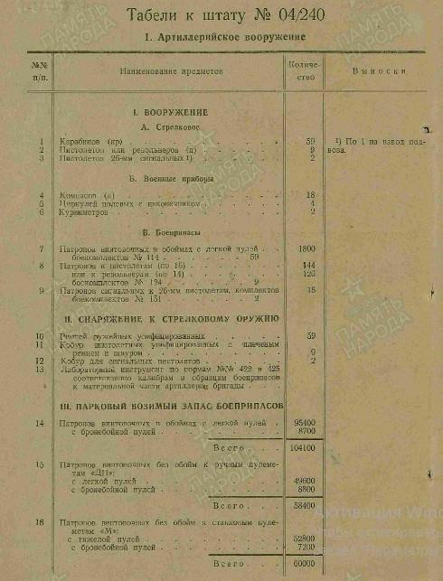 Итого во взводе - 16 человек. На вооружении 1 пистолет "ТТ" или револьвер (п), 3 12,7-мм зенитных пулемёта, 9 винтовок (в) с боекомплектом №114. Военные приборы: 3 бинокля, 4 компаса, 7 очков-светофильтров (о).
