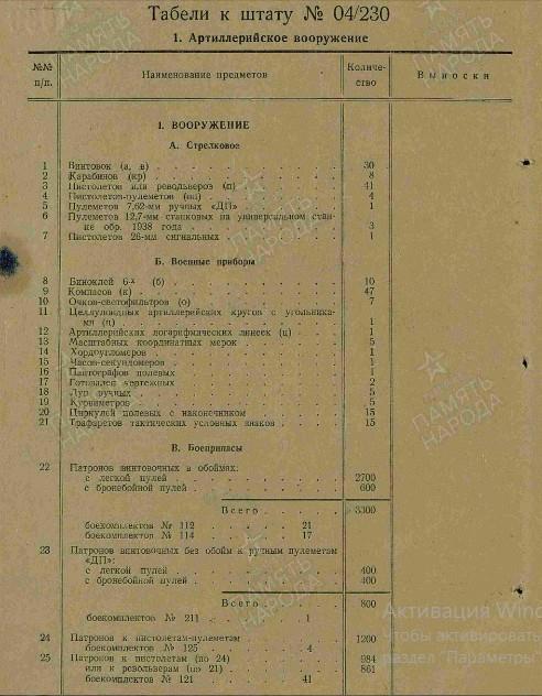 Вооружение: пистолеты и револьверы - 4; пистолеты-пулемёты - 10, винтовки самозарядные "СВТ-40" - 31, винтовки - 20, карабины - 4.