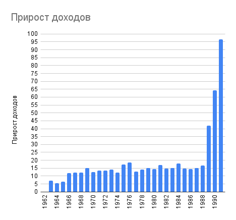 Скачок производной мы видим в 1988, когда была нарушена целостность безналичного контура обращения.