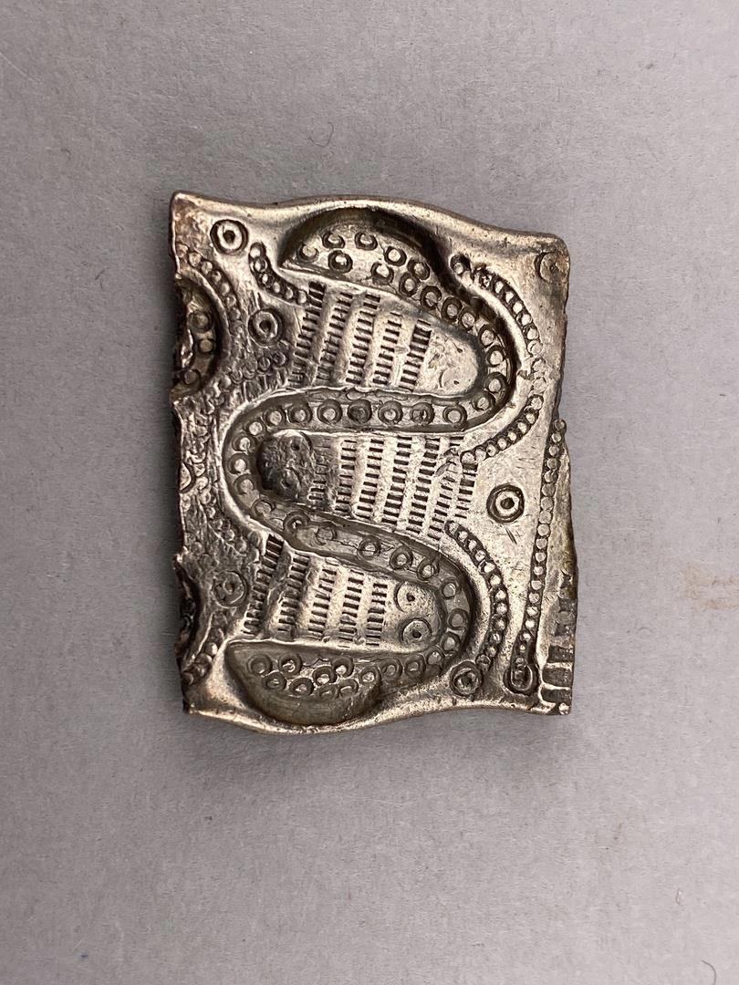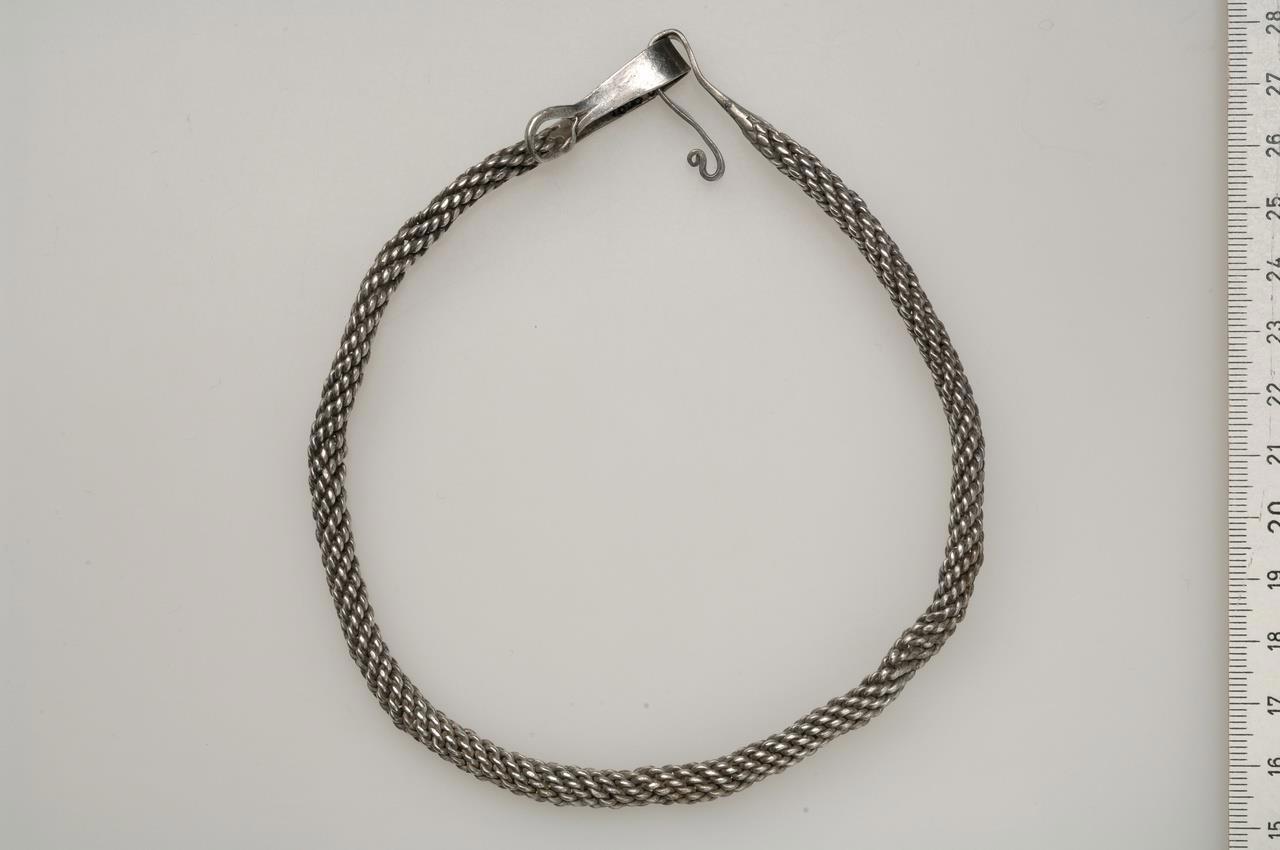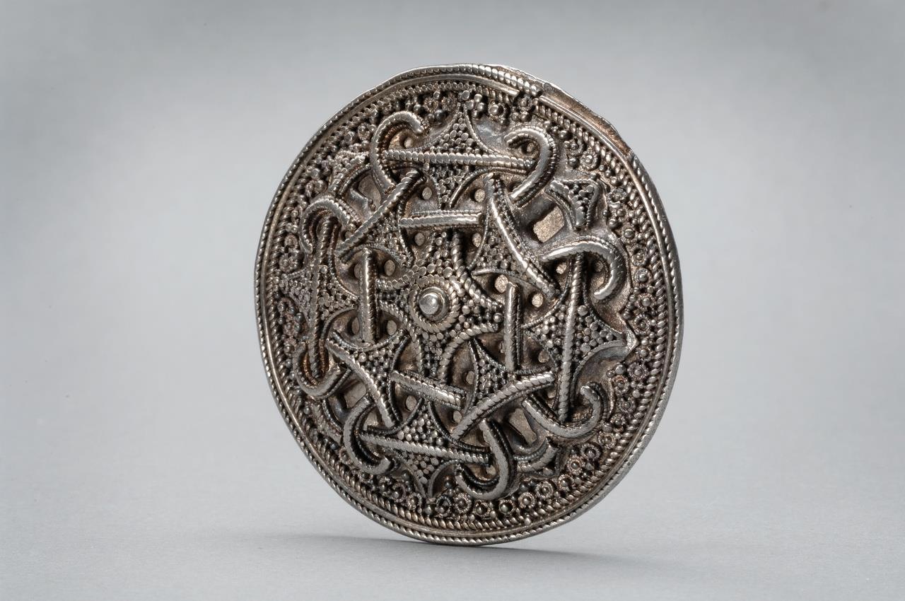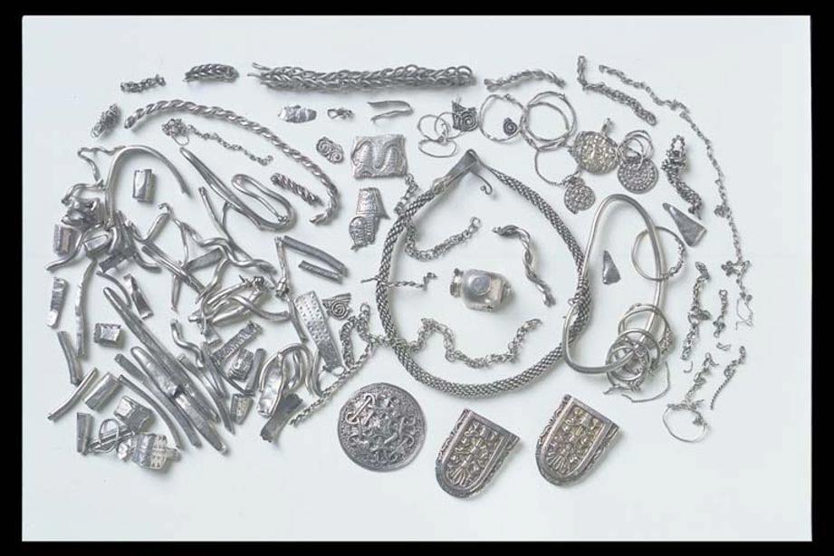Этот клад весил примерно 1 кг и включал круглую филигранную фибулу (мои герои очень любят подобные фибулы носить), шейную гривну, несколько браслетов, два фрагмента от трёхлистника, различные подвески, кольца, фрагменты прочих серебряных изделий, а также множество монет (в т.ч. дирхемы, английскую монету чеканки Эадреда 946-955 гг. и полубрактеат типа "Хедебю"). Предполагается, что клад был спрятан в 955-975 гг.