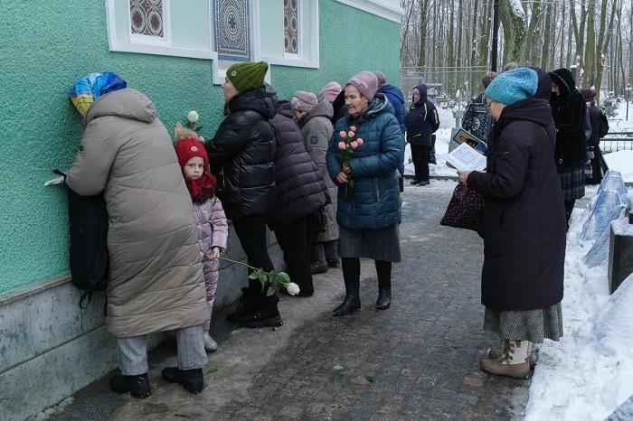 Череда людей тихо стоит среди могил и деревьев до входа в часовню. В этот день в Питере когда тепло, а когда морозно, но количество обнаженных перед входом голов от погоды не меняется. Цветы на морозе стынут, поникают, но расцветают заново, когда их вносят в часовню, где священники беспрерывно служат молебен.