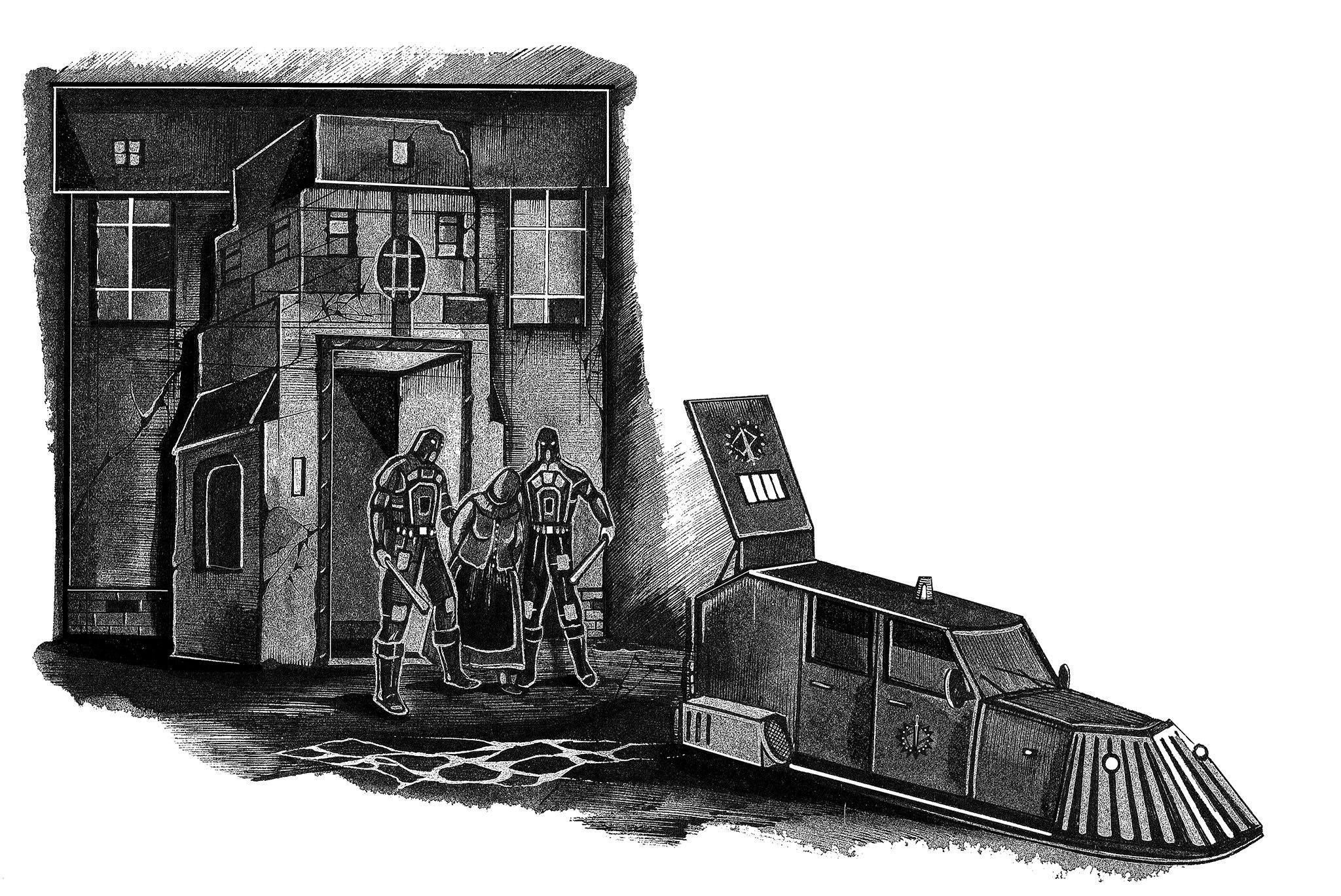 Флаер охранителей по замыслу напоминает то ли паровоз, то ли старый лимузин. Диана Кузнецова нарисовала его по моему эскизу (иллюстрация ниже).