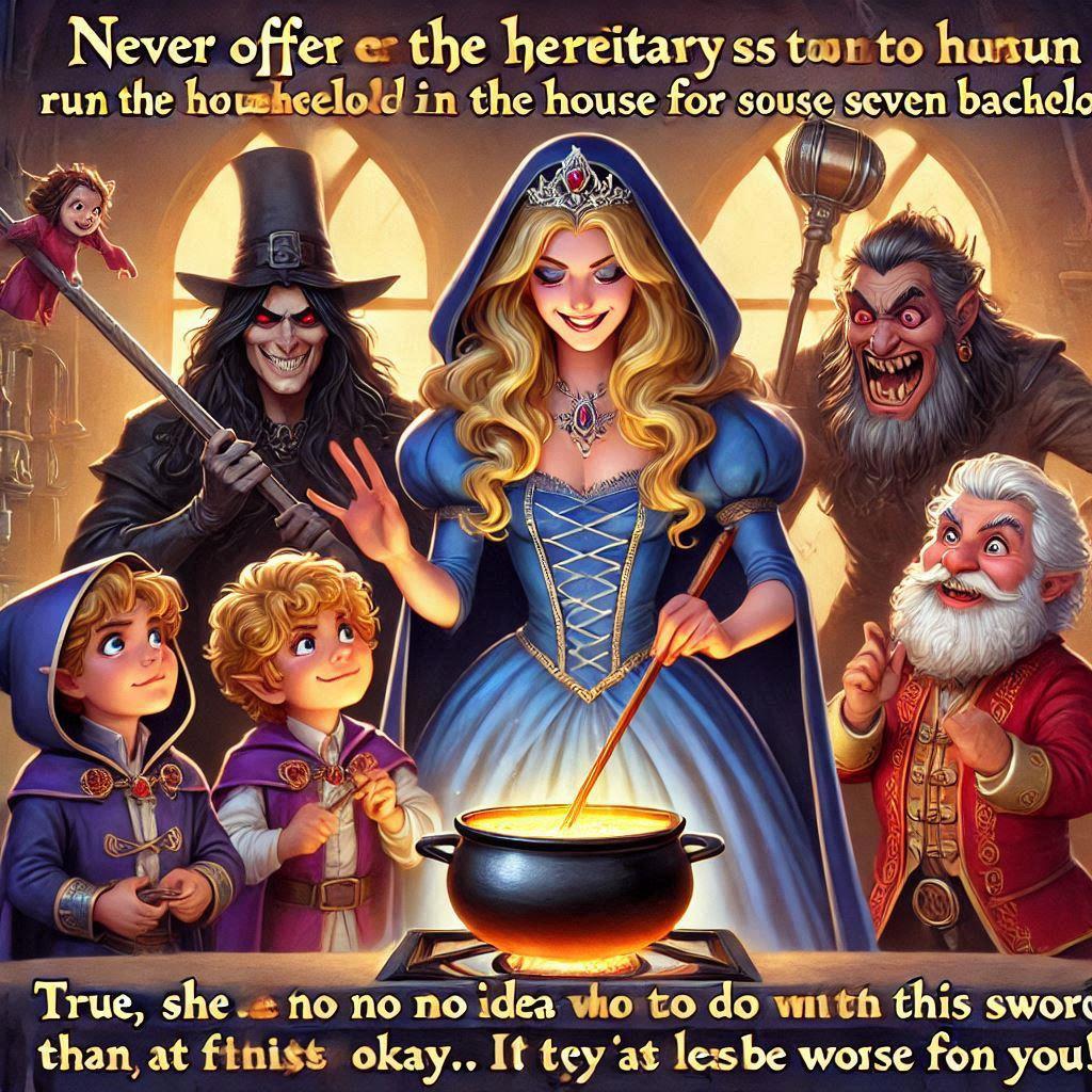 "Царевна, спецназ и царский указ". Кажется, нейронка еще на первой книге начала подозревать что-то насчет Белоснежки... (а кто из славных парней сзади откусил ей палец, мы не будем спрашивать).