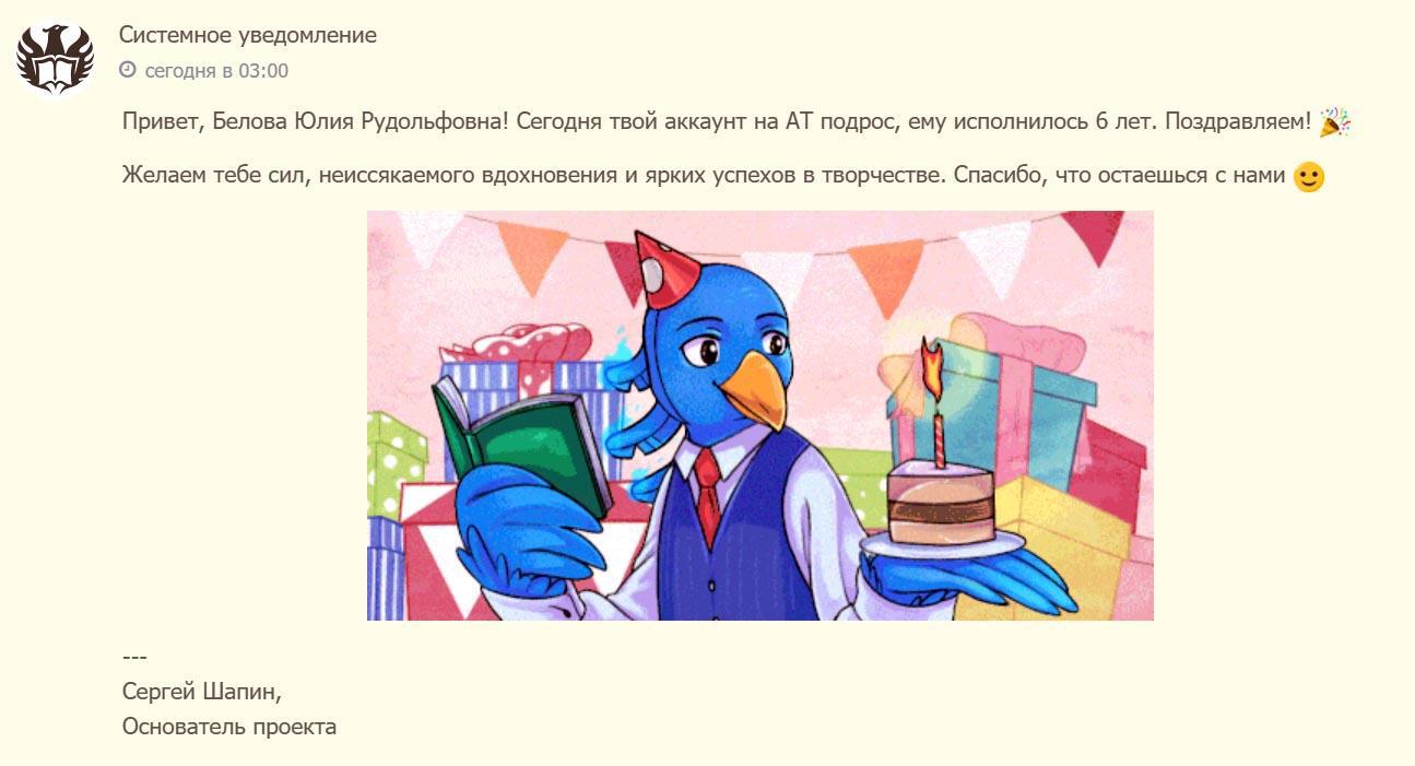 Автор: Белова Юлия Рудольфовна... сегодня исполняется 6 лет, как я на АТ. С чем меня и поздравили в системном уведомлении