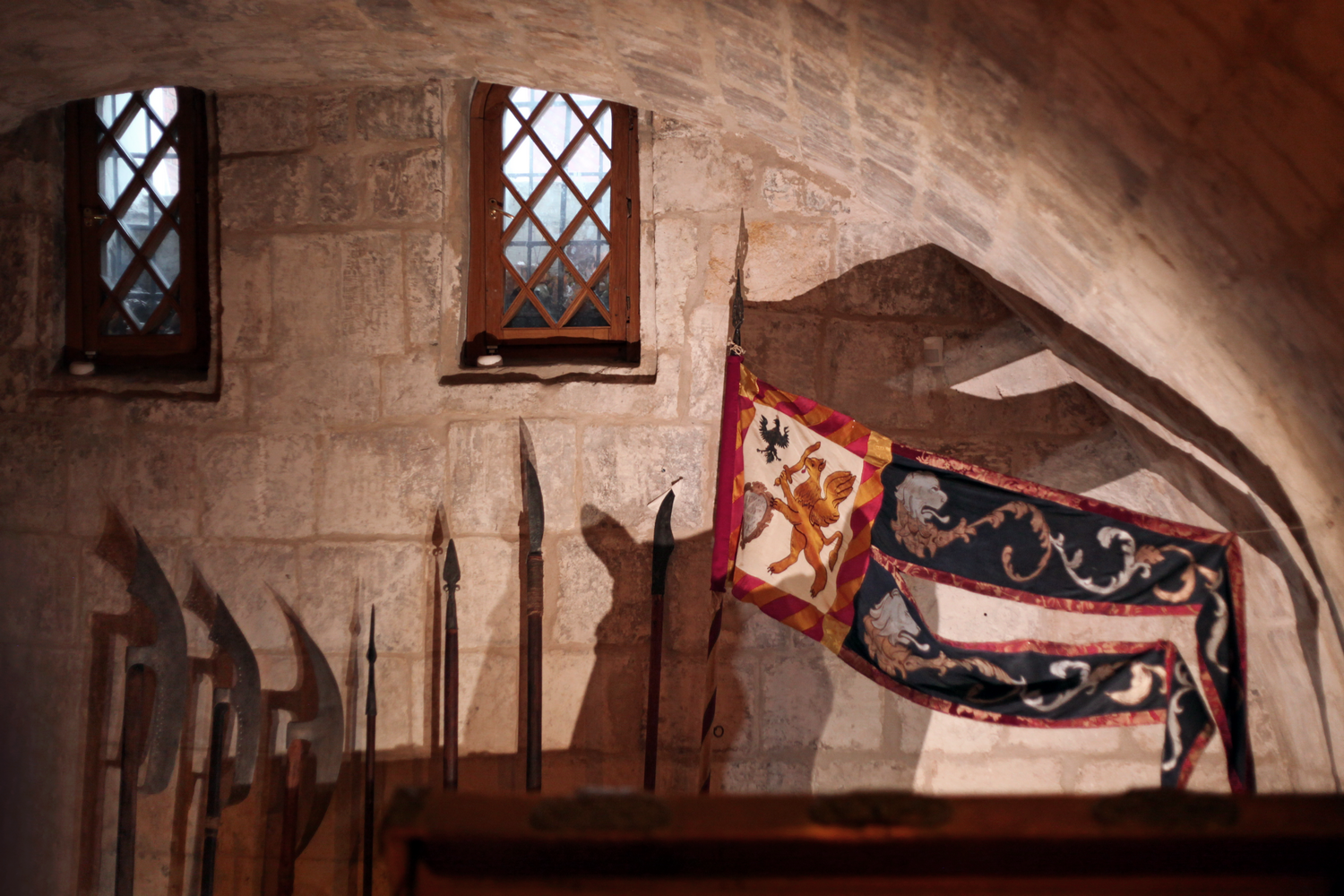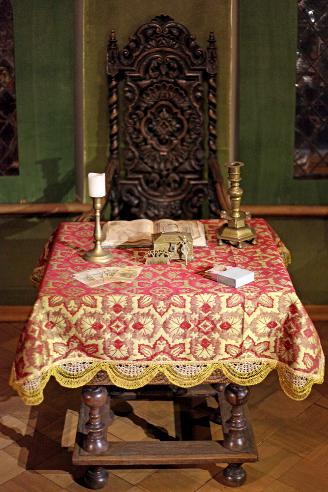 Любопытно выглядит хранилище, наполненное сундуками, холодным оружием и мехами семнадцатого века. Особенно интересен прапор Никиты Ивановича Романова с изображением Грифона. Прапор — личное знамя, которое брал с собой в битву представитель знатного рода (отсюда воинское звание «прапорщик», носитель прапора). Более двухсот лет Романовы пользовались государственным гербом с изображением двуглавого орла, как личным. Романовский герб появился только в 1856-м году после высочайшего утверждения императором Александром II.