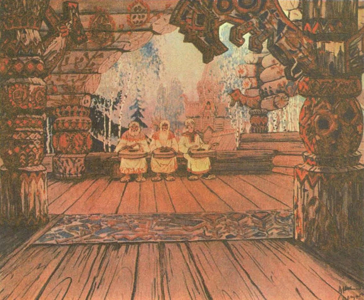 Надо сказать, что поиски стилевого решения картины оказались нелёгкими. Пушкинская поэзия многокрасочна, ярка и найти её зрительный образ помогают нам работы древних русских живописцев. Это, разумеется, не копирование старинной русской фрески, а творческое переосмысление изумительных художественных мотивов, дошедших до нас в работах по дереву, в русском лубке, даже в росписи прялок...