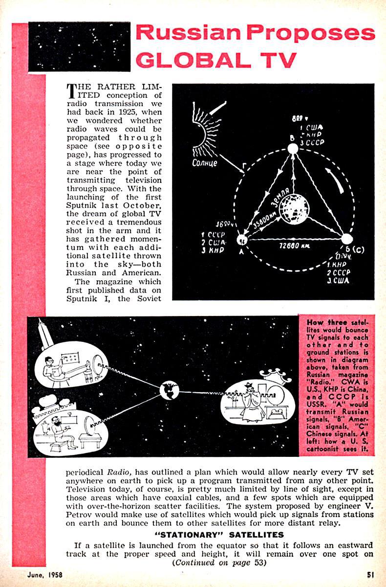А вы знаете, что современное спутниковое телевидение с геостационарными спутниками - это советское изобретение? Это сейчас про это забыли, а тогда так и называли - русской схемой глобального телевидения