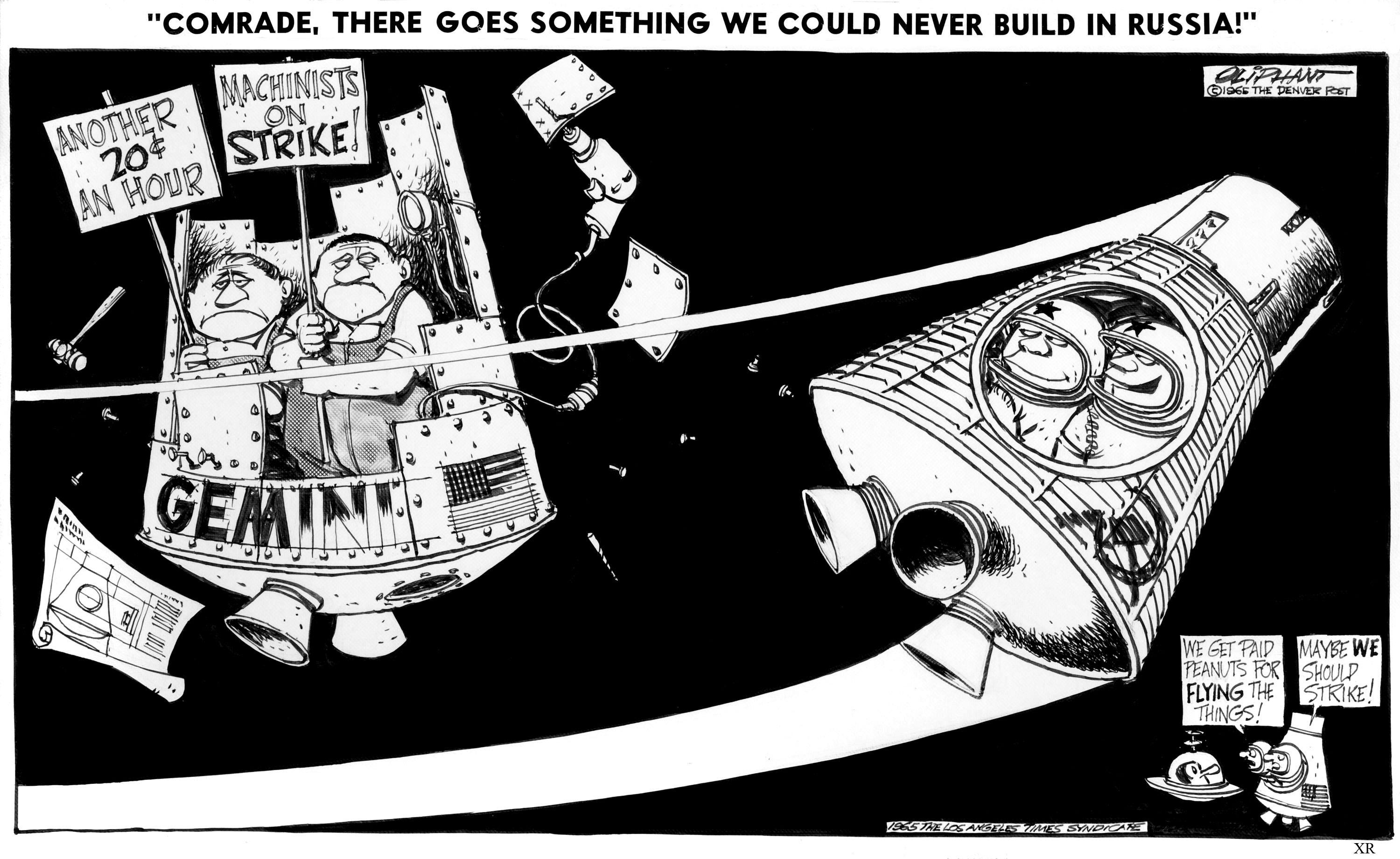 Карикатура 60-х, сравнивающая советскую и американскую космические программы