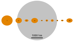 Сравнительные размеры Луны и 10 первых астероидов, расположенных в порядке открытия. 1 — Церера, 2 — Паллада, 3 — Юнона, 4 — Веста, 5 — Астре, 6 — Геба, 7 — Ирис, 8 — Флора, 9 — Метида, 10 — Гигея