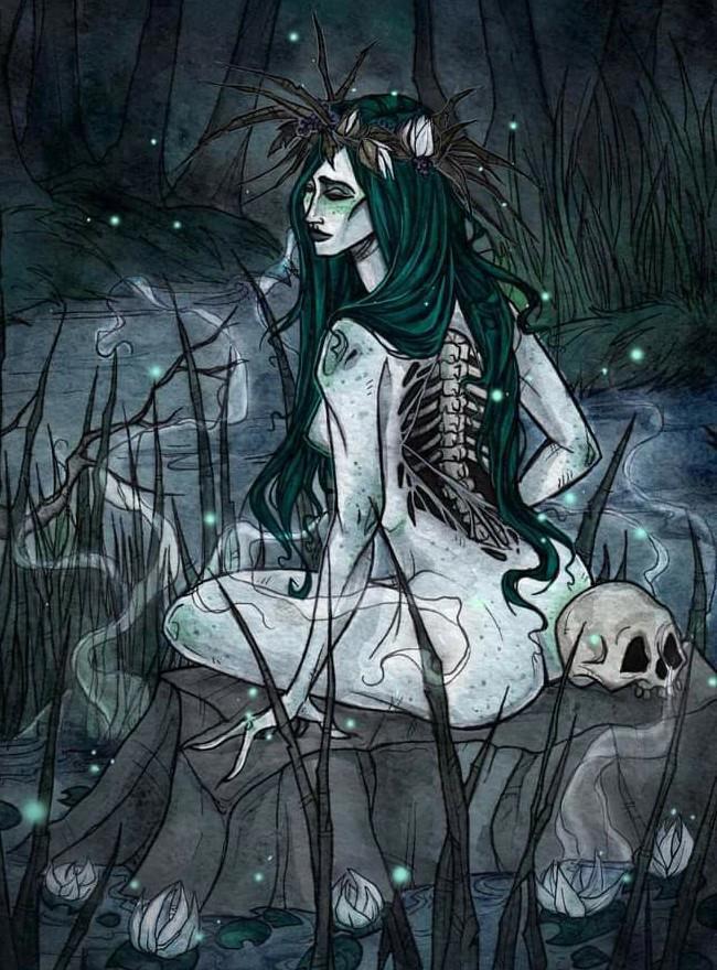4) Болотник. Утонуть вы можете и в болоте, и тогда станете его обитателем. Болотник почти не отличается от человека, лишь весь покрыт болотной трясиной. А болотница это прекрасная девушка, но с лягушачьи и лапами. Она прячет ноги и приманивает к себе прохожих, а потом топит.