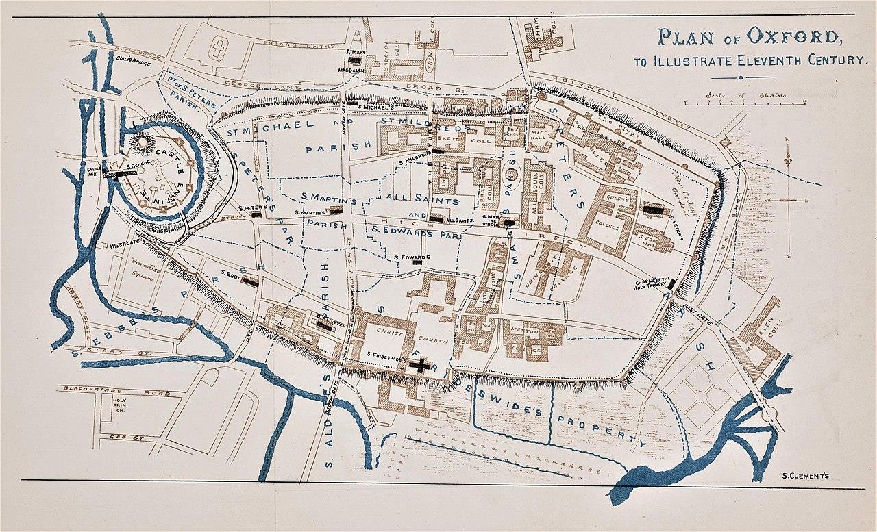 План средневекового Оксфорда. Выделены здания колледжей университета.